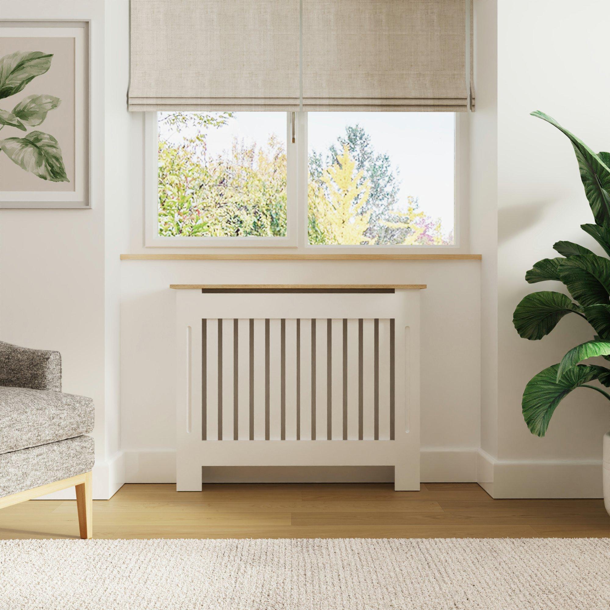 Elevate your home’s aesthetics with the Longslow Radiator Cover, available in both sleek grey and classic white finishes. Perfectly blending with contemporary interior designs, this cover combines painted and melamine surfaces to ensure durability and ease of maintenance. The Longslow Radiator Cover not only adds a touch of elegance to any room but also provides a practical solution for concealing your radiator. Create a warm and inviting atmosphere while keeping your living space organized and stylish with this elegant addition. The cover features a vertical slat grill pattern that exudes sophistication and style, with rounded edges to ensure safety. The top shelf provides an ideal space for displaying decorative items, storing books, or placing photo frames. This design not only enhances the aesthetics of your room but also adds an extra layer of safety for children and pets by preventing direct contact with hot radiators. The cover is easy to assemble and comes with instructions for hassle-free installation. Before placing your order, please measure your radiator to ensure that the internal dimensions of the radiator cover are slightly larger than those of the radiator for a proper fit.