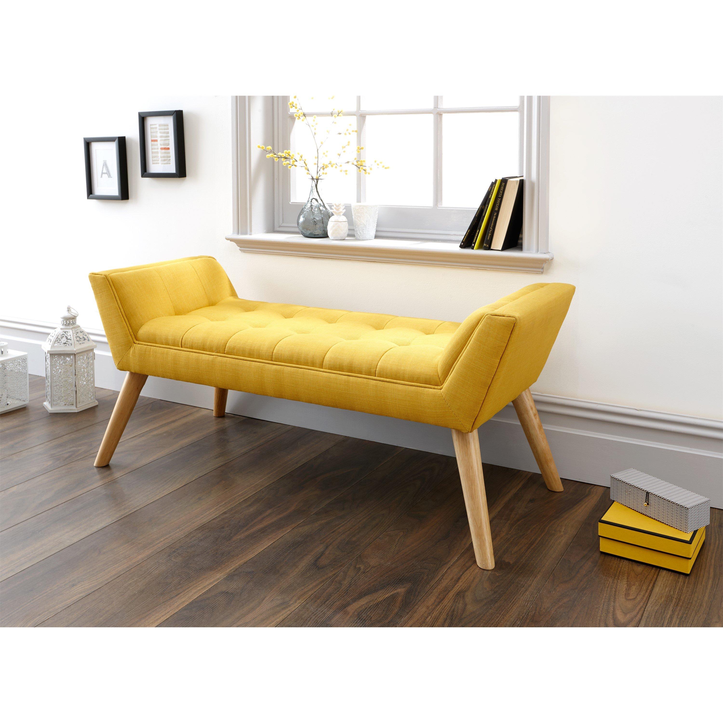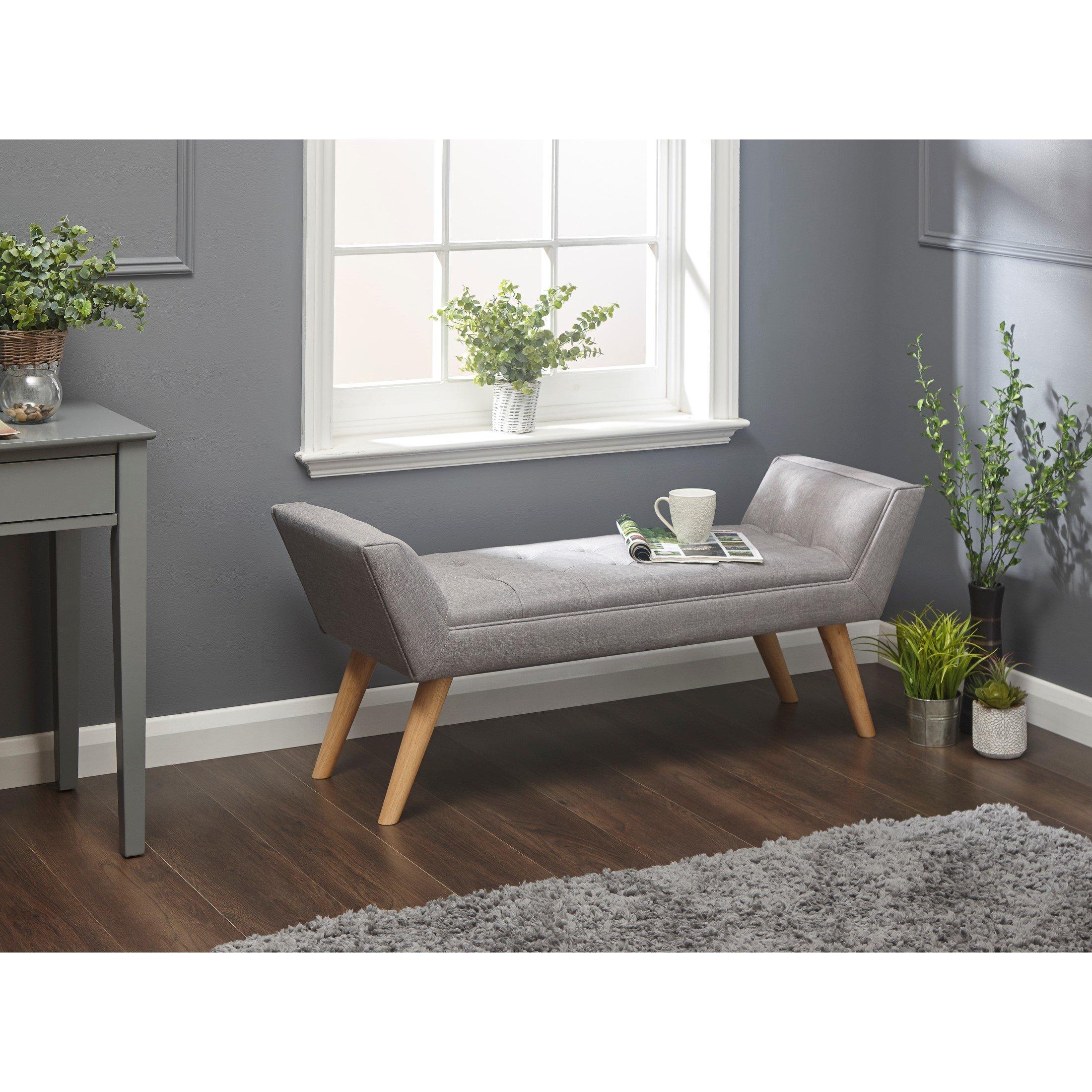 A smart upholstered bench is a neat addition to any room, providing a handy extra seat for guests or offering a vantage point for a great view when positioned in a window recess. Milan epitomises Scandi charm. Textured hopsack fabric conceals deep-cushioned seating and emphasises the benchs crisp profile. The elegant retro-style legs are made from solid polished wood and contrast beautifully with the fabric. Easy to assemble, this lovely mid-century-inspired furnishing piece is versatile enough to grace any home.