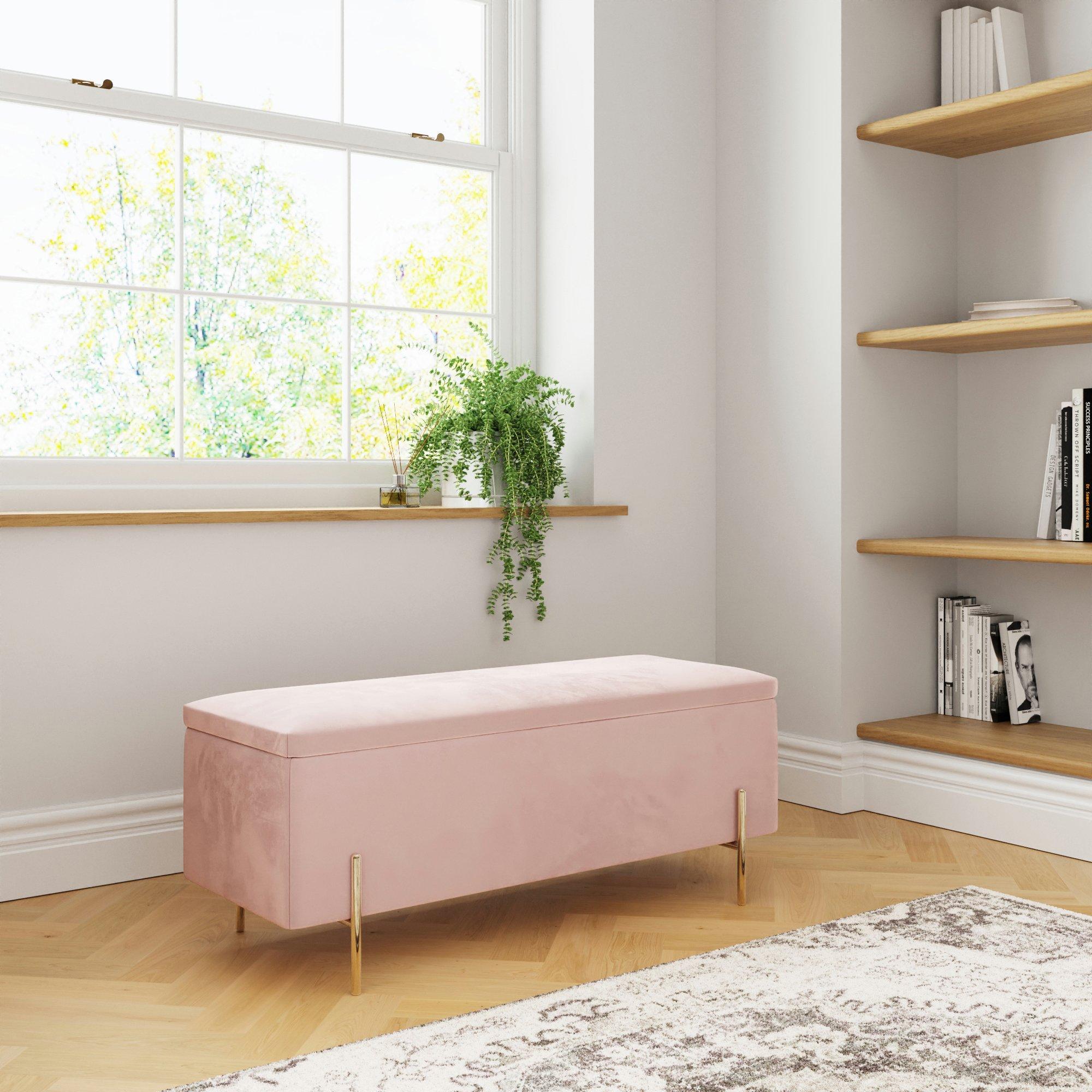 Every bedroom needs a storage box and Mystica is the perfect choice. The simple design makes it a good match for most interiors pick from a selection of in-vogue colourways to suit your style. The ottoman has a hinged lid and features a generous lined compartment that's ideal for extra bedding and cushions. Both frame and seat are upholstered in a tactile plush fabric with a matt velvet pile that looks and feels indulgent. The simple gold-effect metal legs add to the minimalist look and feel.