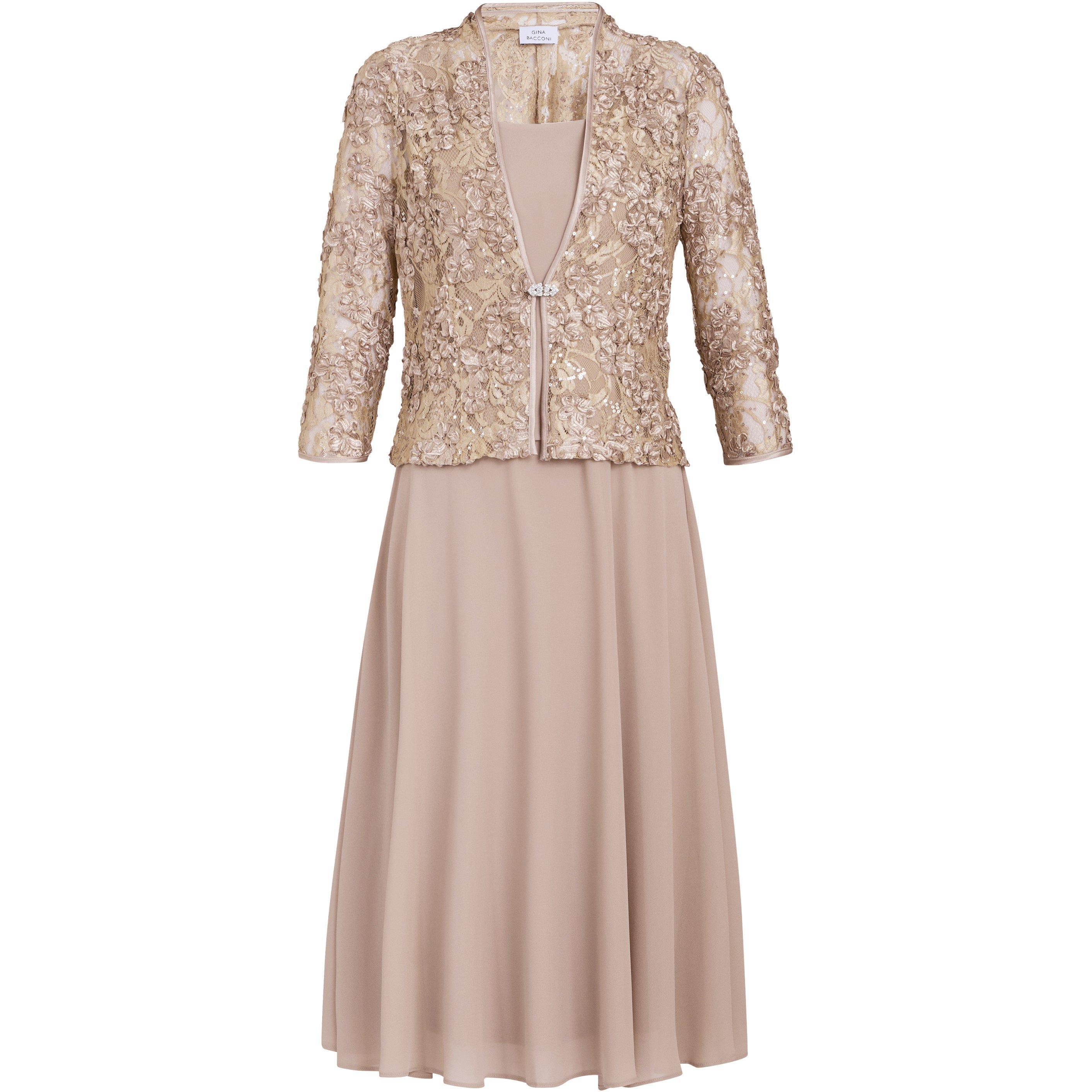 This beautiful ensemble features a soft, flowing sleeveless chiffon dress in a sophisticated neutral beige tone with a matching jacket. The jacket is crafted from intricate lace with delicate embroidery and subtle embellishments for some sparkle. This two-piece set is a harmonious blend of softness and sophistication. Ideal for mother of the bride, weddings, or any elegant occasion. Measuring 118cm