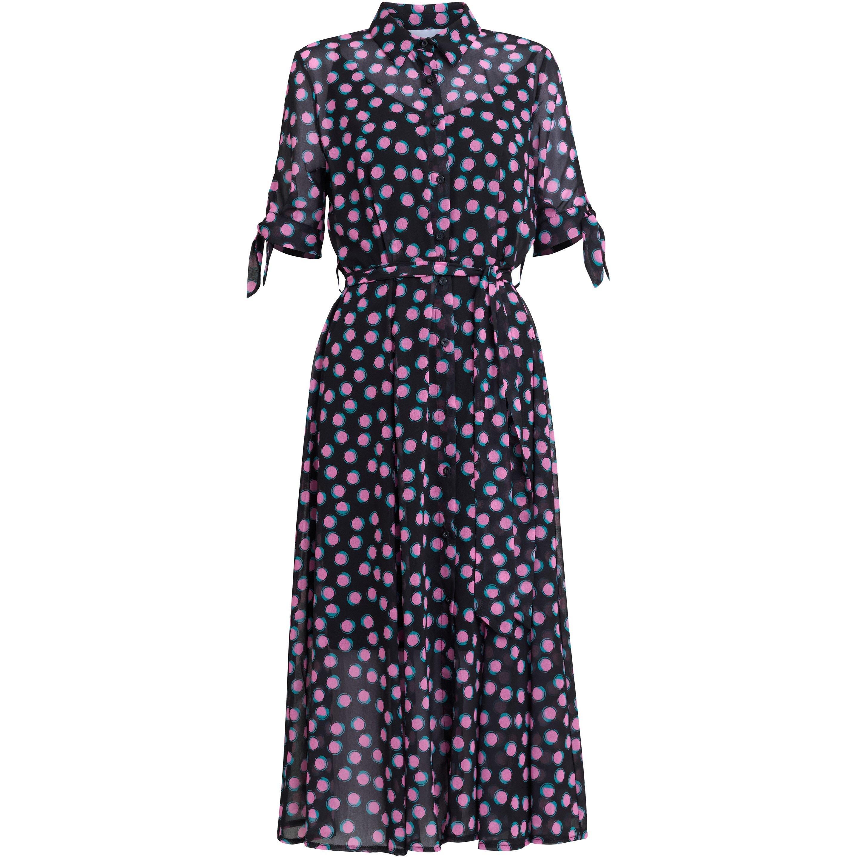 Gina Bacconi's Adrienne Shirt Dress features a spot pattern on a classic base, great for work to weekend fashion. The full button-down front and self-fabric tie belt create a defined shape, while knotted short sleeves add contemporary detail for both casual and professional styling.