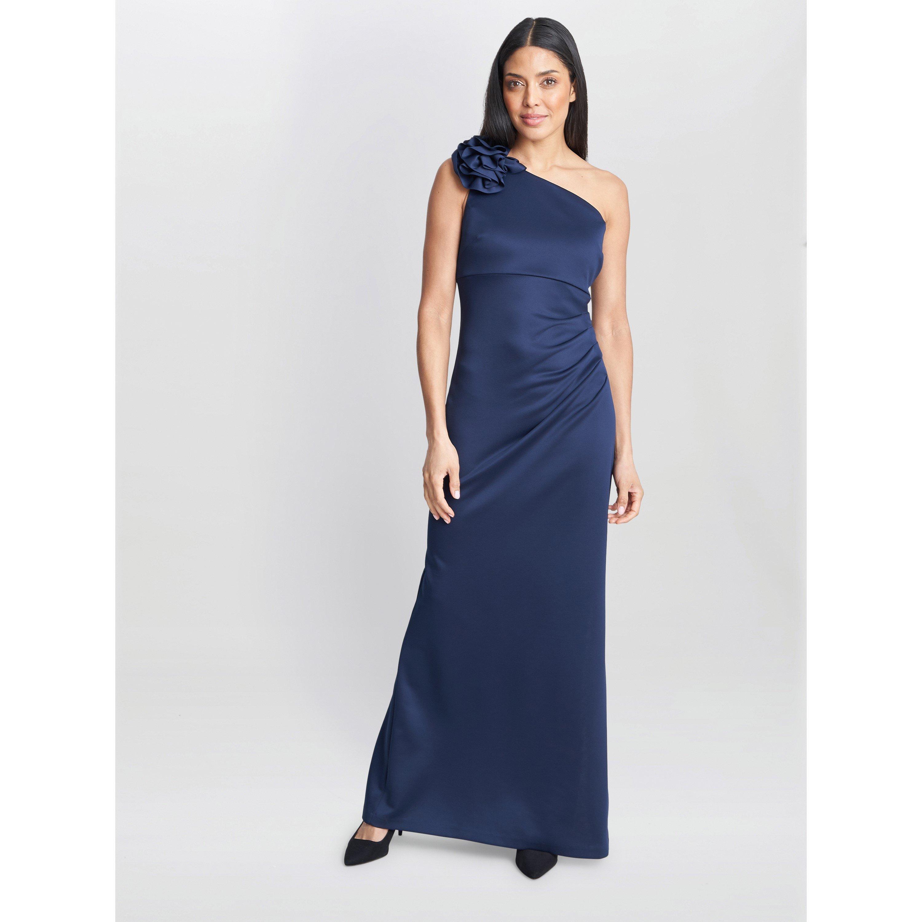 This stunning asymetirc evening dress with flower applique on the shoulder is sure to WOW at any occasion event!