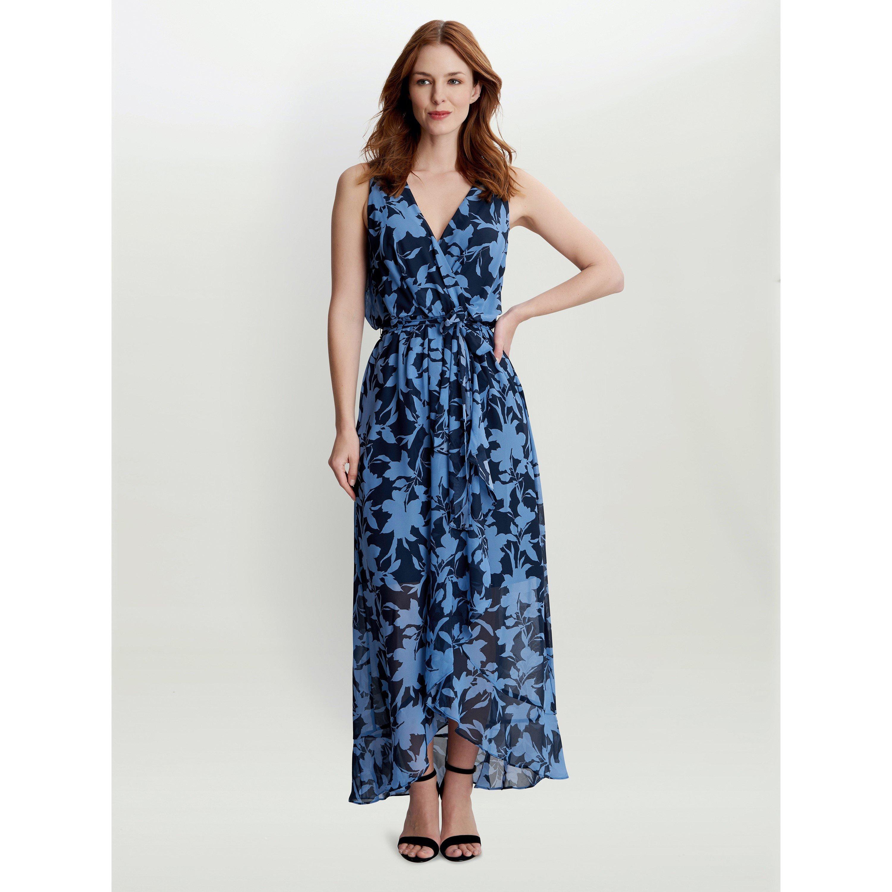 Make this stylish floral dress by Gina Bacconi part of your wardrobe this season. It features v shaped wrap over neckline and dipped waterfall hem with ruffle detailing that ensures you look graceful as you move. This dress is fashioned from a crinkle chiffon. This gorgeous dress fastens with concealed back zip and features tie waist detailing.
