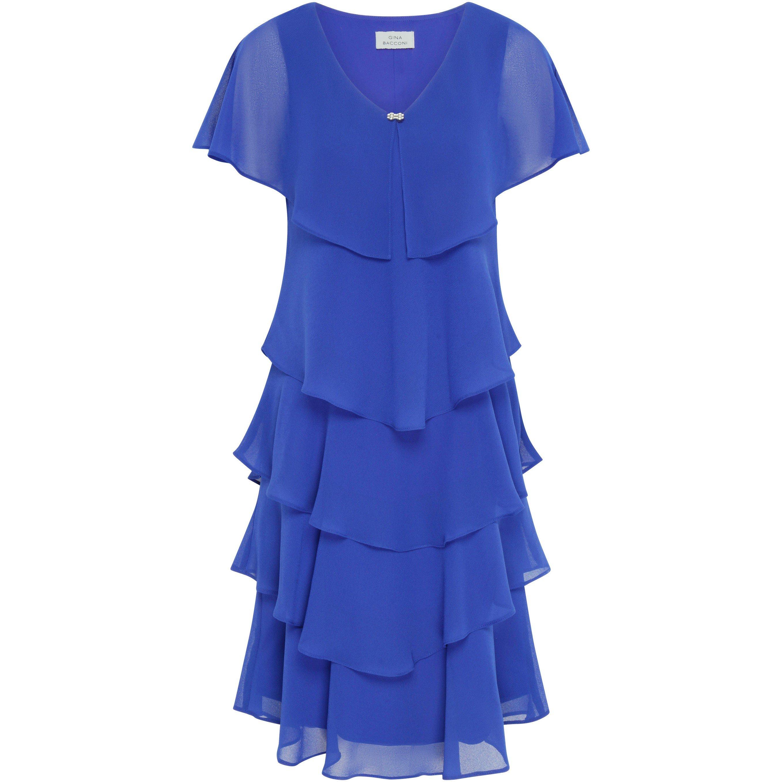 Feel wonderful in this floaty rich blue tiered cape dress by Gina Bacconi. This dress takes a modern and flattering shape in layered pebble georgette with diamante detailing at the neck. Perfect for an event, this piece offers both comfort and elegance. This dress is lined and measures 99cm.