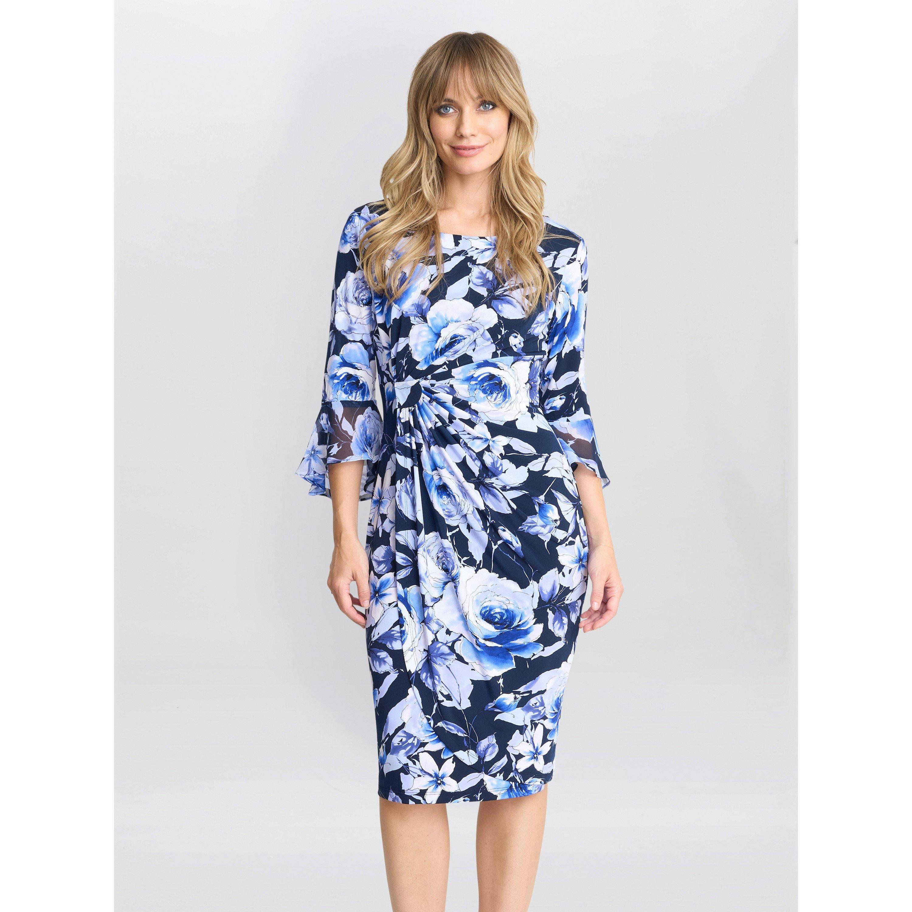 This printed jersey and chiffon mix dress features a faux wrap detail at the waist to create definition for a flattering silhouette. The matching flared sleeve creates the sophisticated look for a day to evening look. This dress is in a stretch jersey with a chiffon cuff and is zip free for ease. It measures 106cm