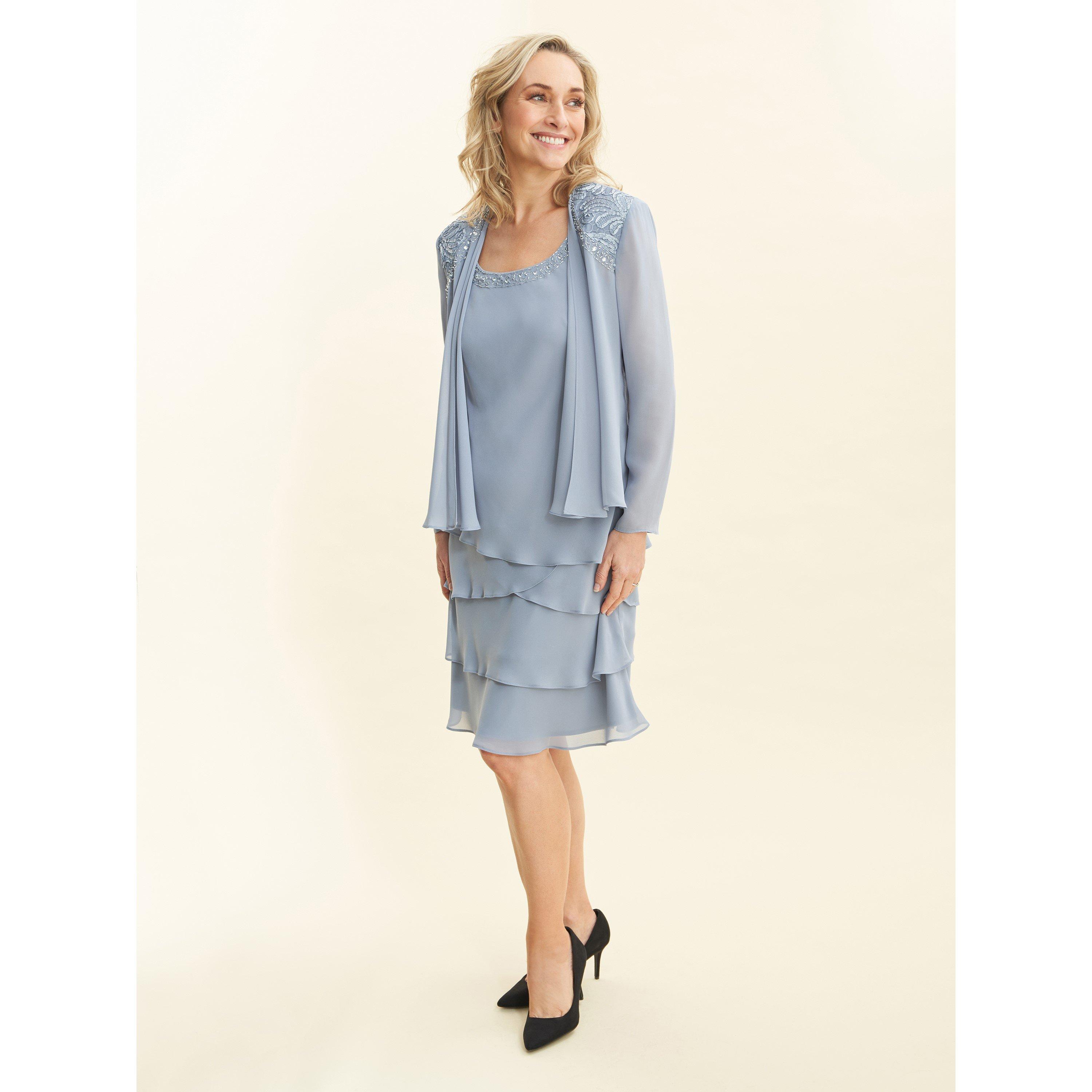 Detailed with a beaded neckline and tiers of flowy chiffon, this tank sheath dress comes with a matching lace-shoulder jacket.
