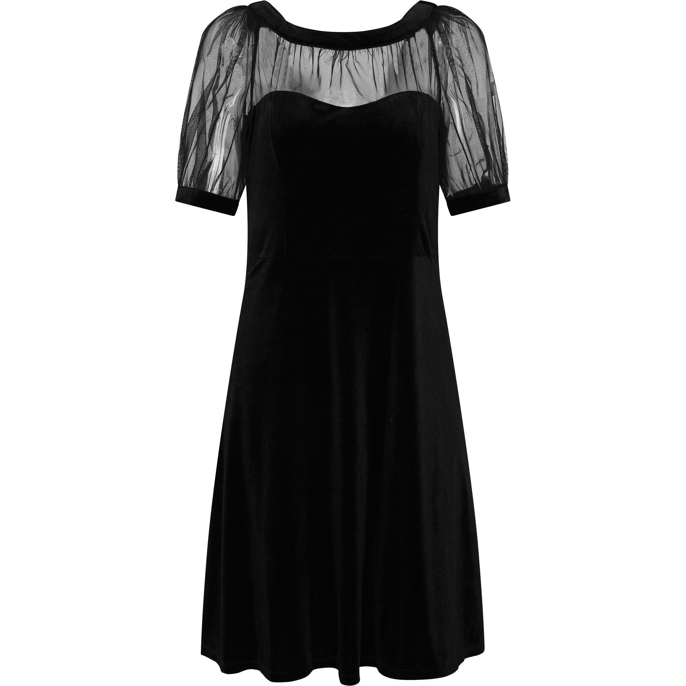 The Capri black velvet dress brings timeless elegance with a modern twist. Made from a soft velvet, this knee length dress features a fitted bodice with a flattering neckline, enhanced with a sheer overlay. The sheer sleeves add a touch of sophistication, making it perfect for evening events.