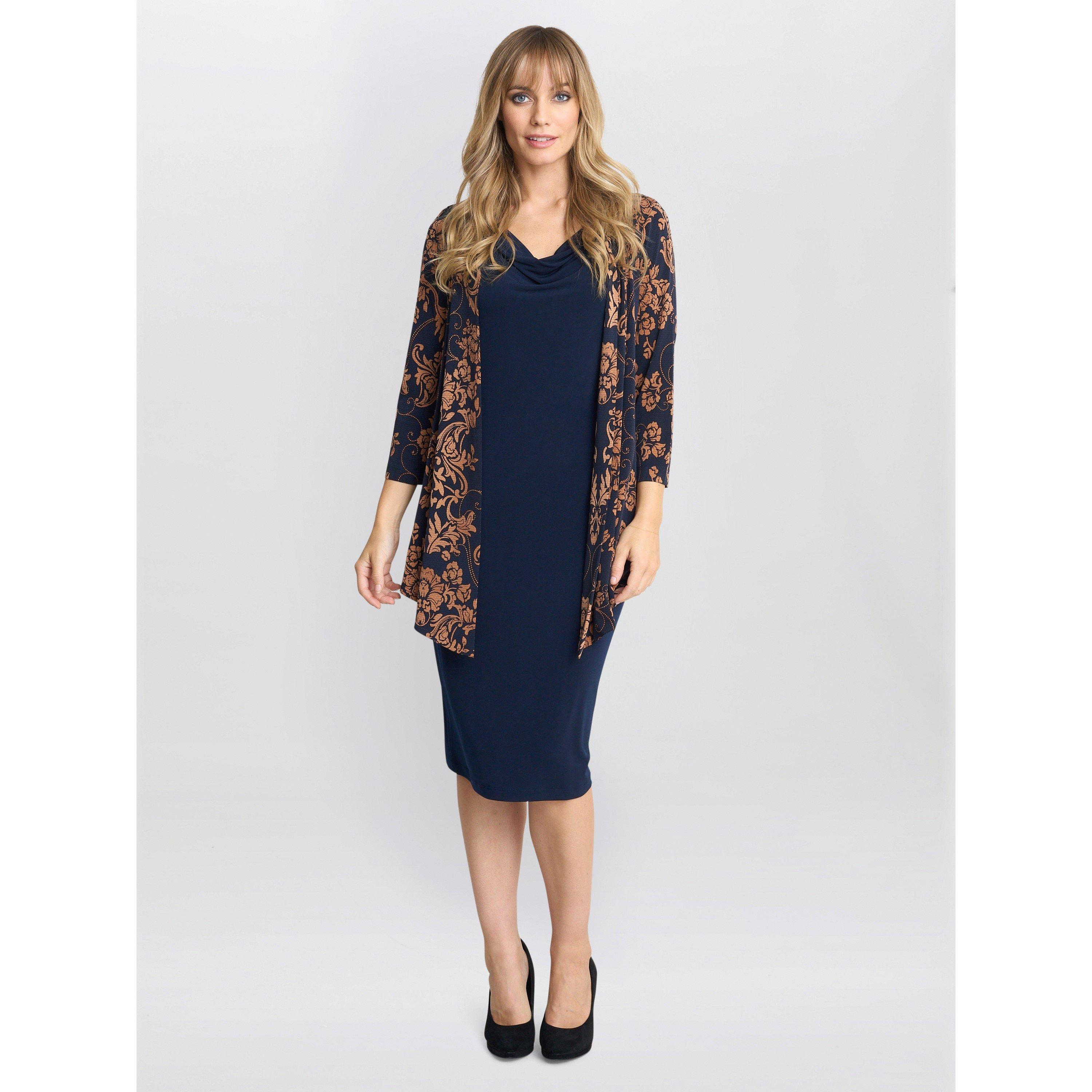 In a luxurious jersey fabric this cowl neck dress with attached jacket design strikes the perfect balance between ease and sophistication. The jacket is attached at the shoulder seam only so the movement is kept. This dress falls below the knee and is unlined. This dress is zip free! The dress measures 108cm