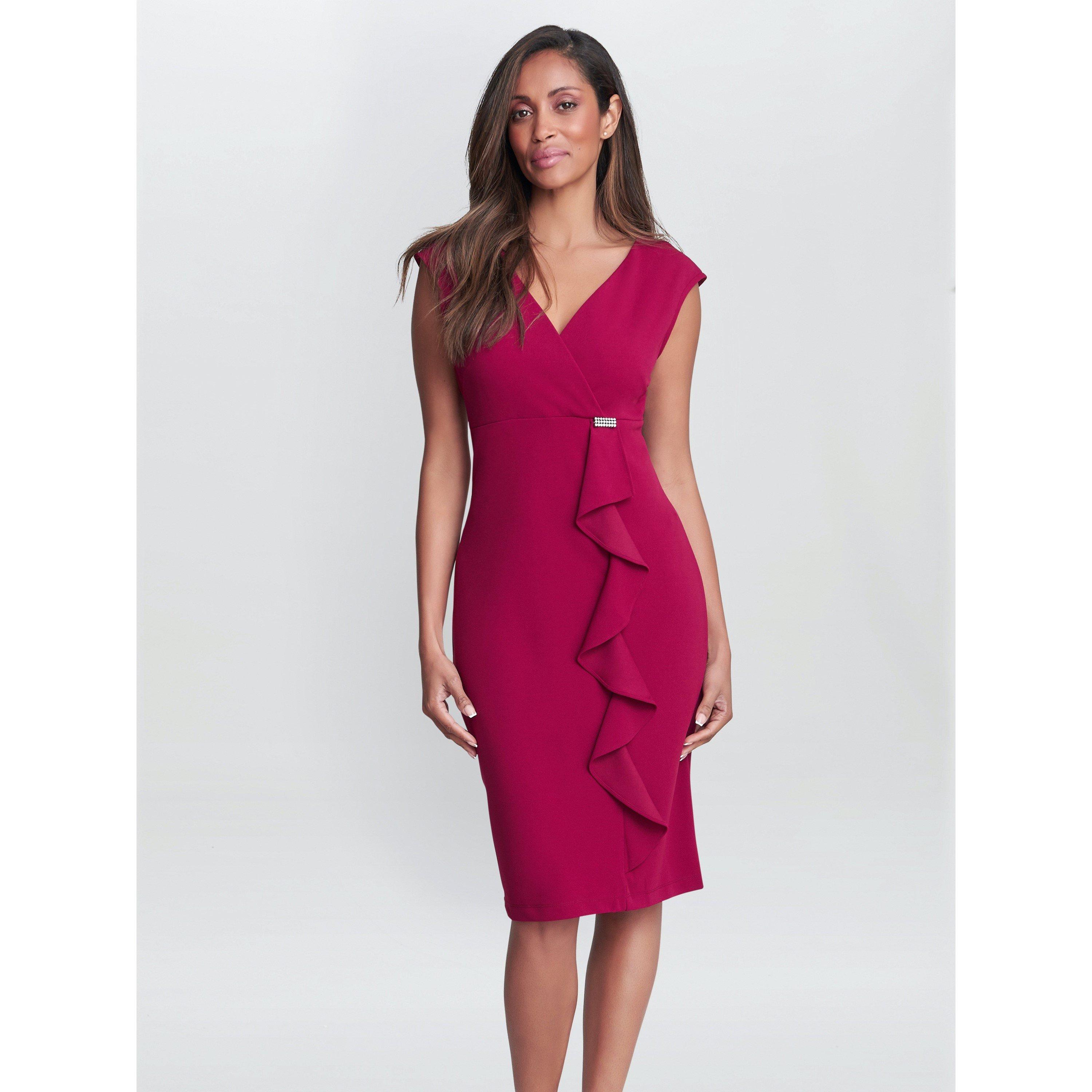 Feel gorgeous in this elegant stretch moss crepe dress by Gina Bacconi. Featuring diamante detailing at the waist with frill cascading down the front of the skirt. The lightweight stretch crepe is perfect for evening and occasion.