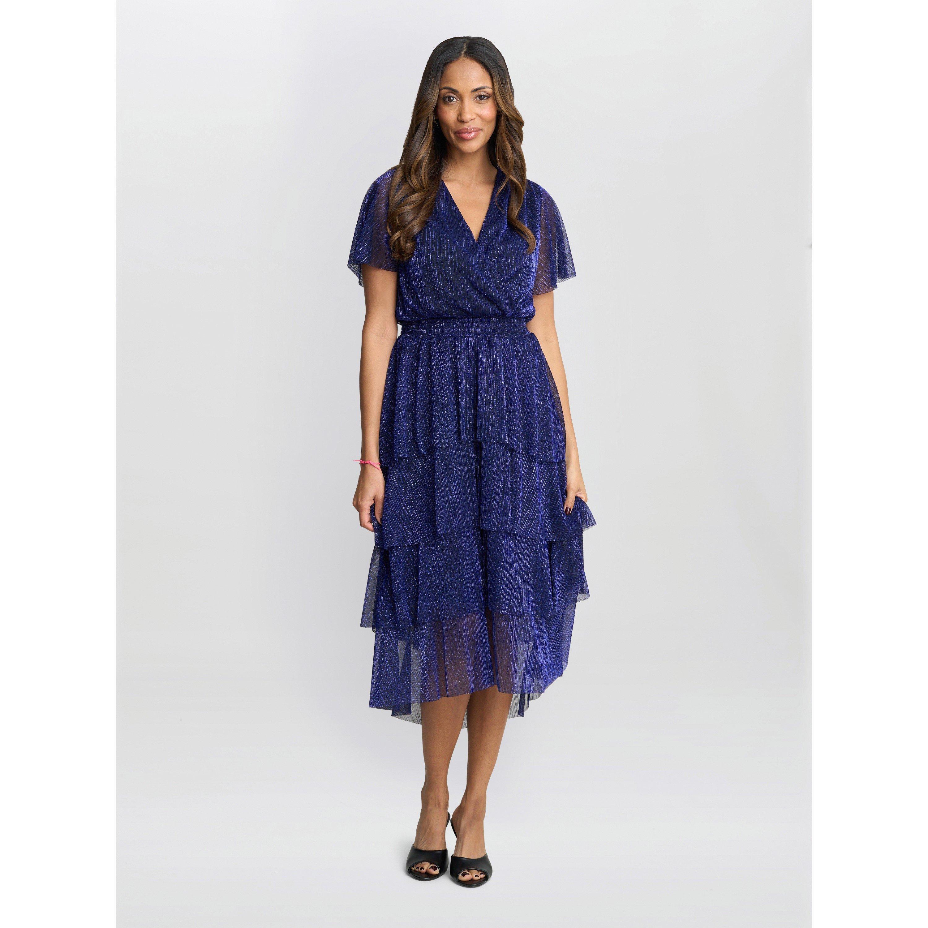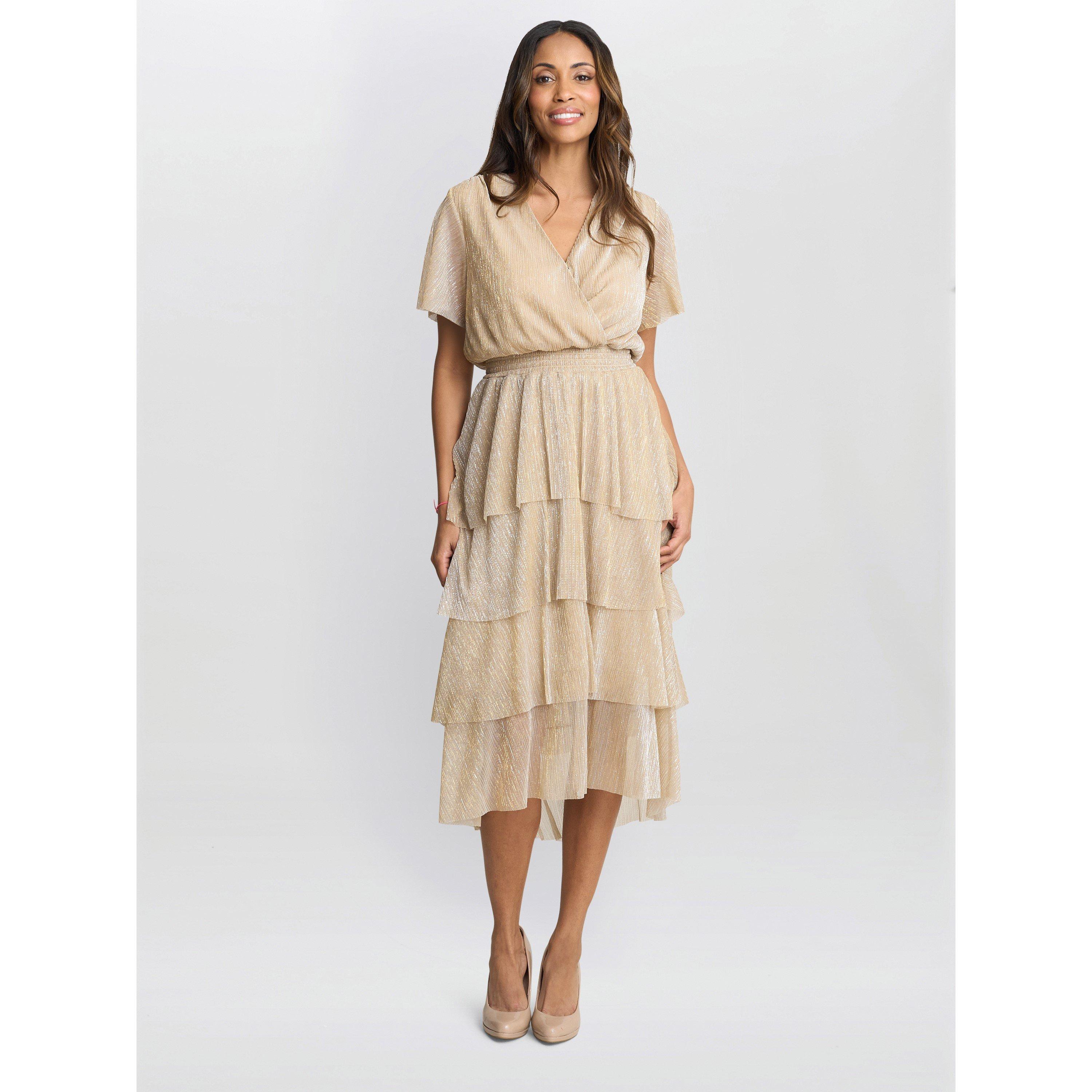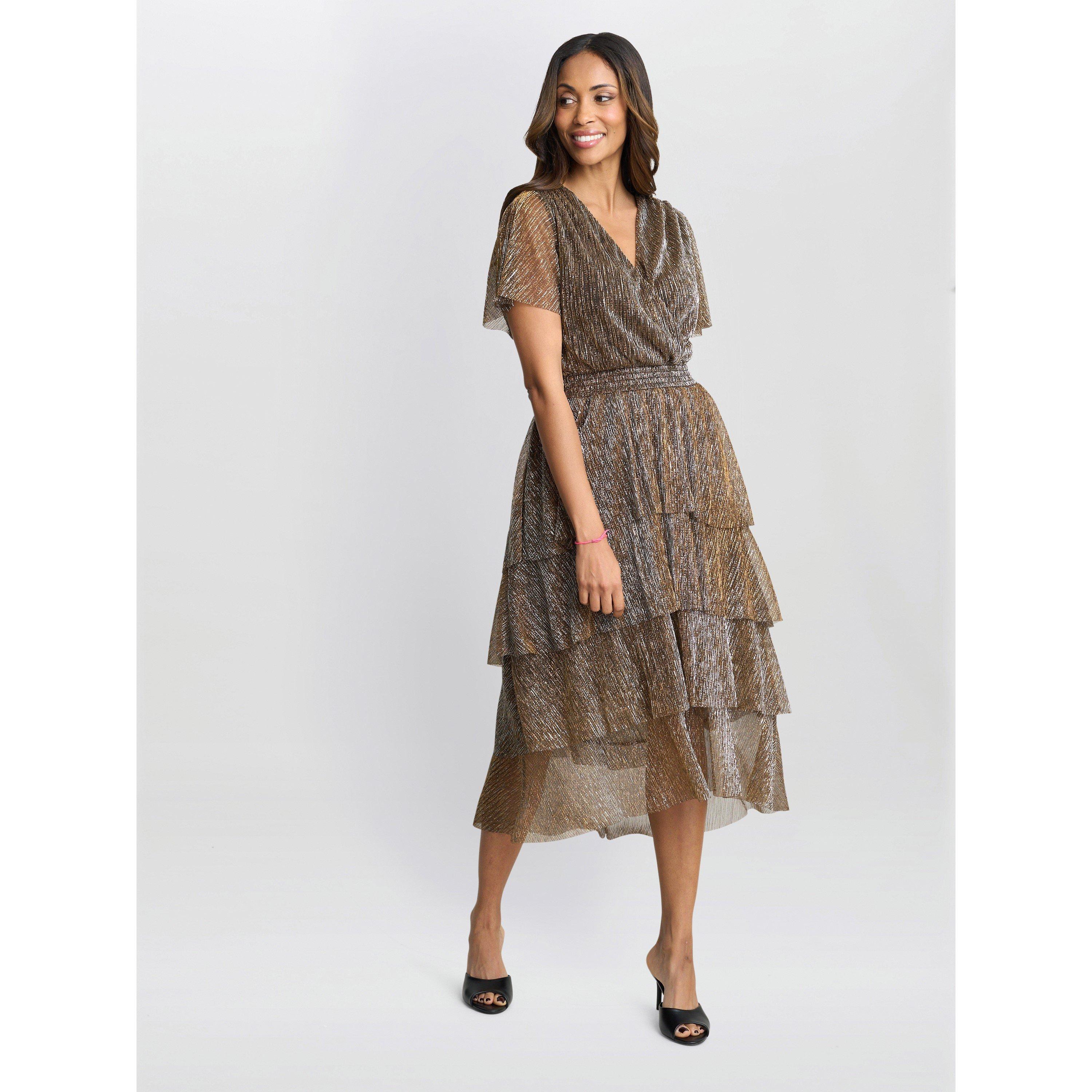 In a lurex, black and gold thread, knit fabric, this tiered dress is a sure favourite. Its wrap bodice is flattering and the elastic waist makes for a comfortable fit. This dress hits below the knee and is longer at the back. It is lined until the bottom of the third tier.
