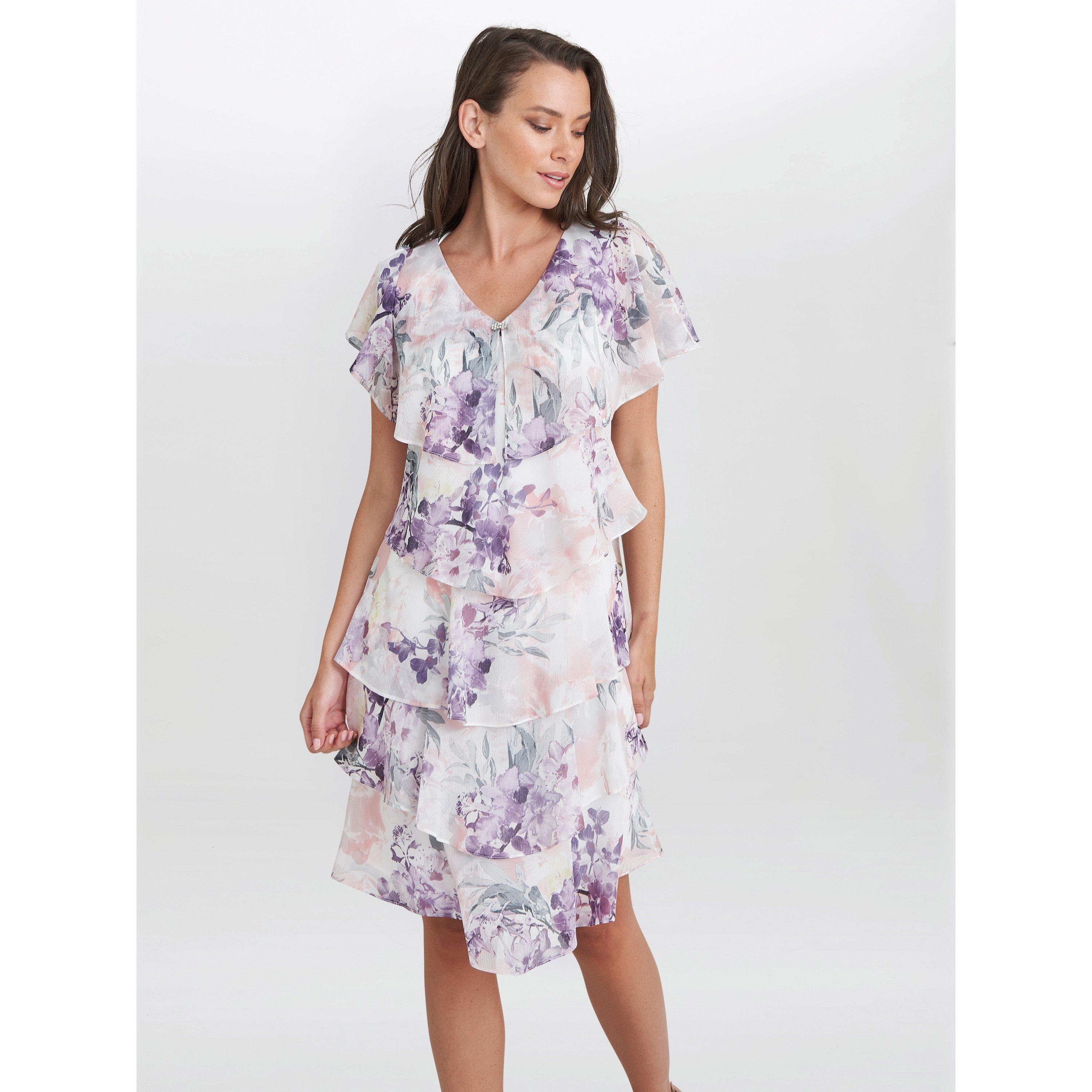 Feel wonderful in this floaty-tiered cape dress by Gina Bacconi. This dress takes a modern and flattering shape in layered floral print chiffon with diamante detailing at the neck. Perfect for an event, this piece offers both comfort and elegance.