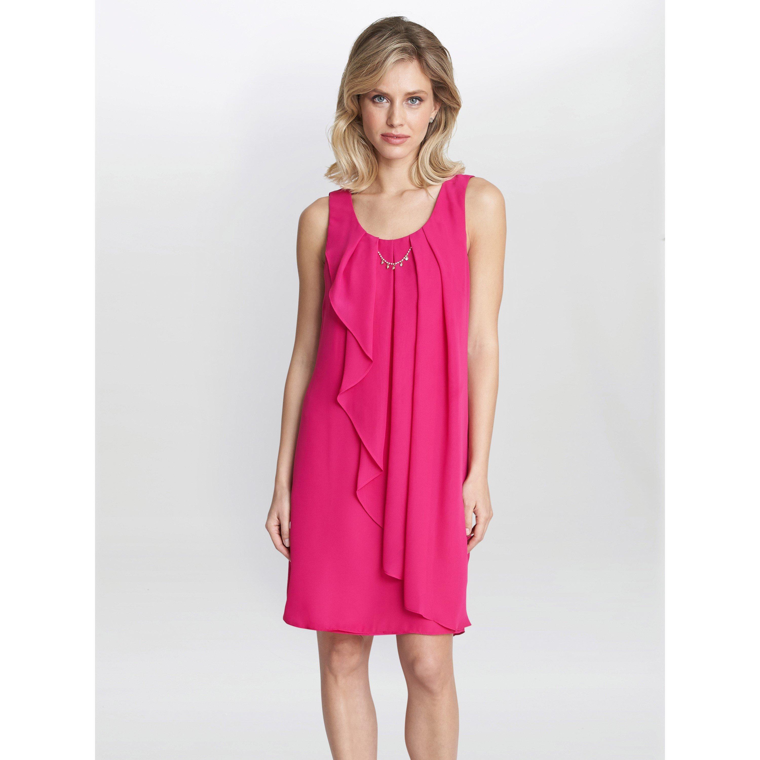 This waterfall front chiffon dress with delicate necklace detail is a party winner! In a vibrant pink this dress is perfect to throw on this summer, dress with sandals or heels. It has a full lining.