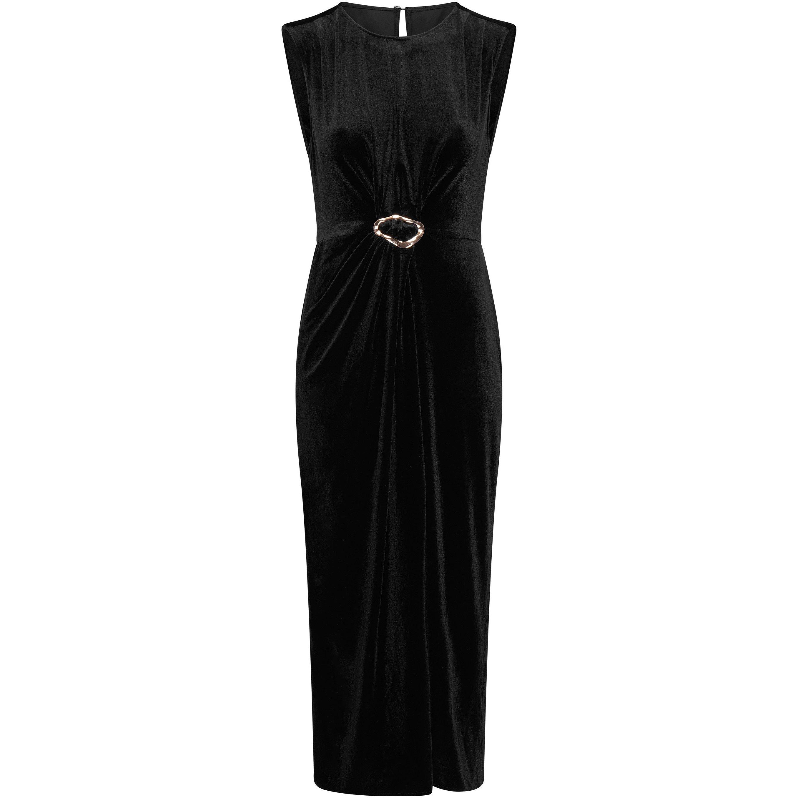 The Claudine dress is a sophisticated velvet midi dress, made from a black velvet, it features a sleeveless and classic round neckline. The standout detail is the gathered waistline, cinched with a gold tone buckle that creates a flattering silhouette. This dress offers effortless glamour, perfect for evening events or any special occasion.