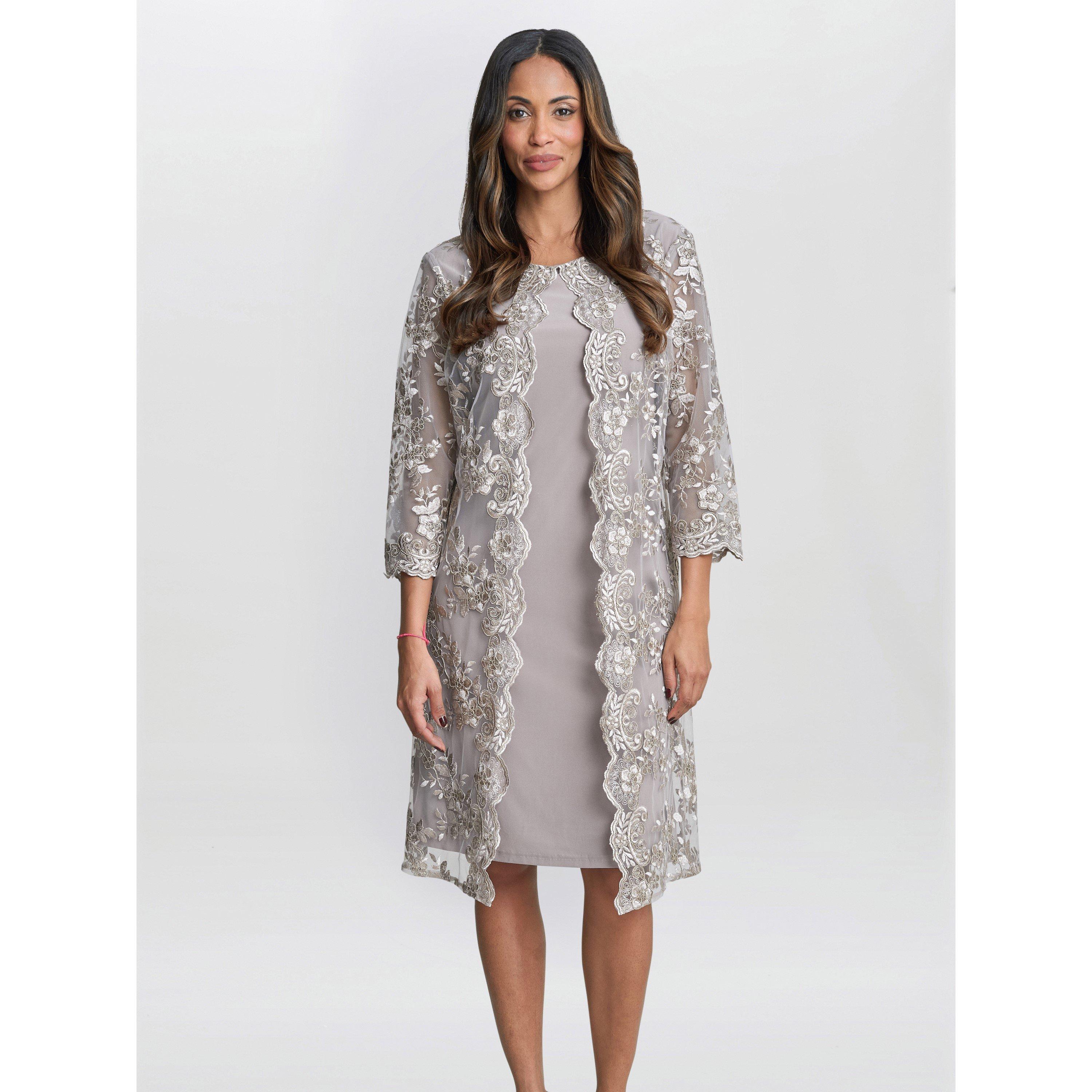 Our Daryl mock dress and jacket look in crafted in a beautiful embroidery with a scalloped edge. The look has an illusion sleeve and zip at center back.