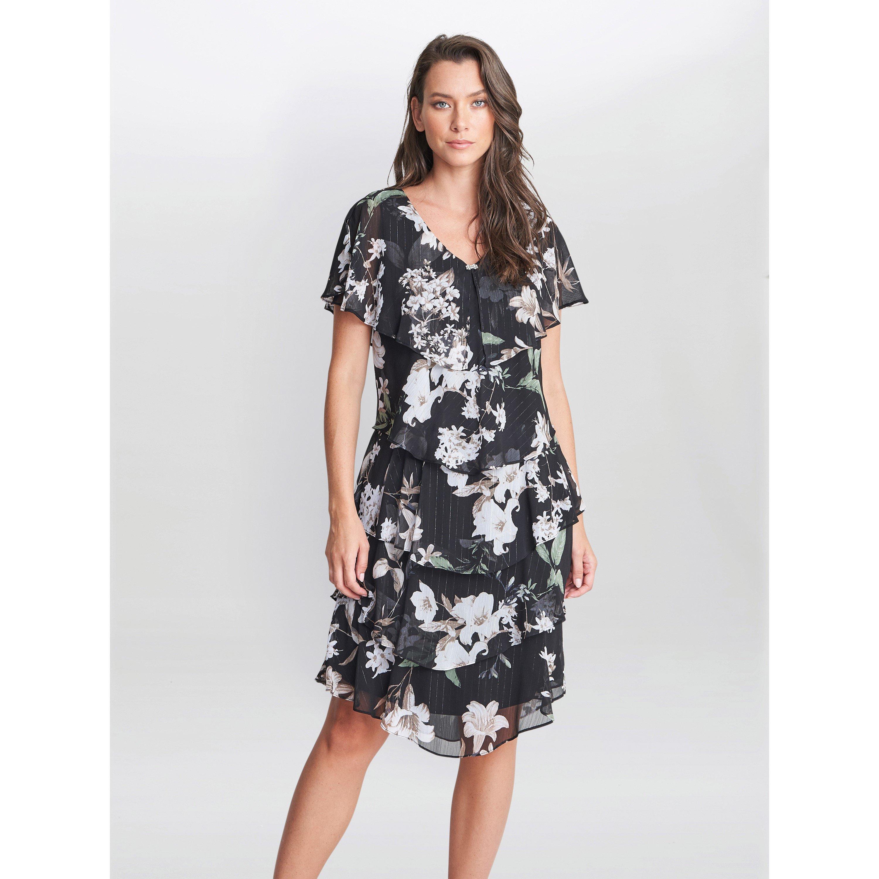 Feel wonderful in this floaty-tiered cape dress by Gina Bacconi. This dress takes a modern and flattering shape in layered floral print chiffon with diamante detailing at the neck. Perfect for an event, this piece offers both comfort and elegance.