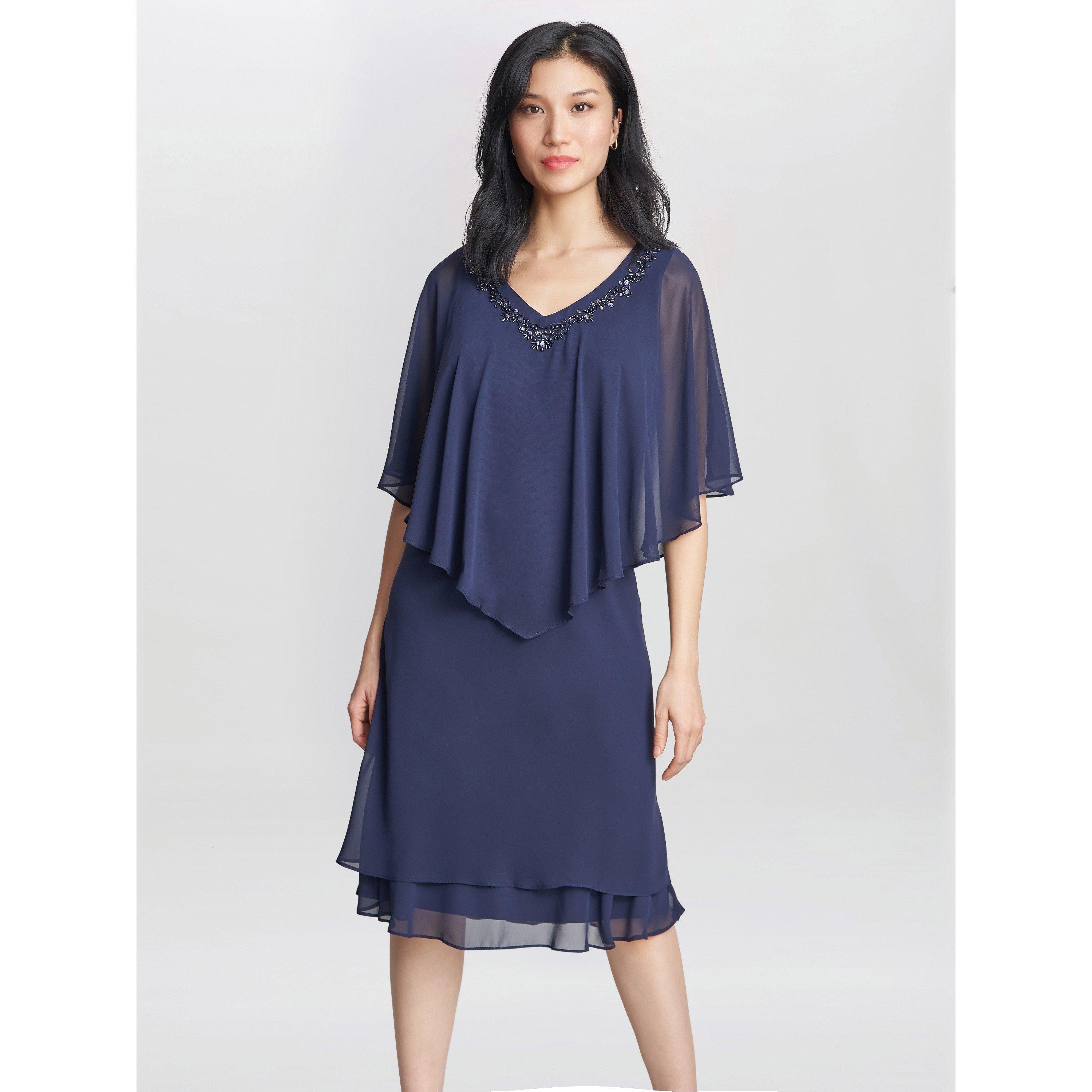 Flattering and elegant this caped chifon bias cut dress features delicate beading at the V-neck front. The attached chiffon cape over-top makes the dress great for all sizes and gives sleeve coverage. The dress has no zip and finishes below the knee.