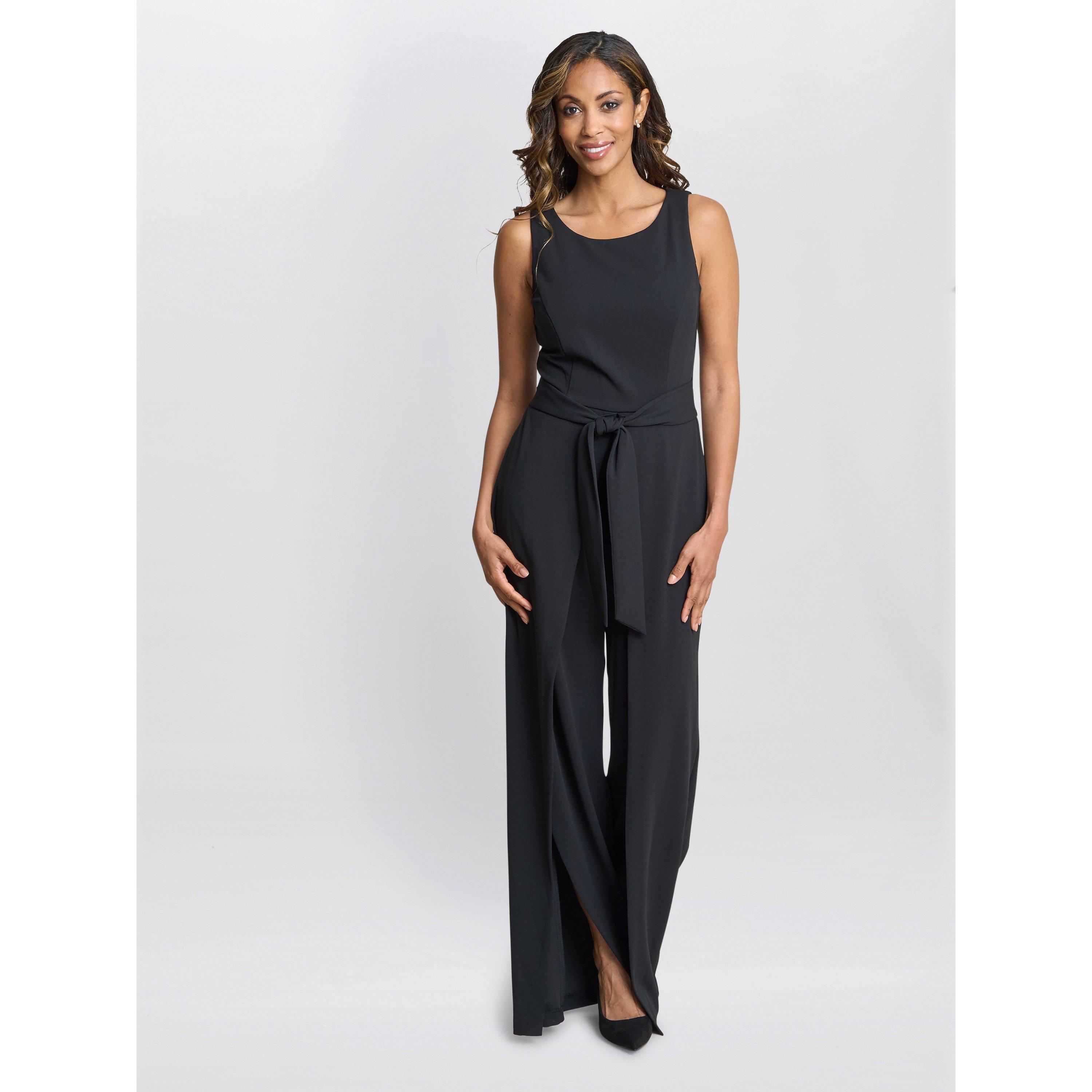 This elegant soft stretch crepe jumpsuit features a wrap effect leg and tie waist. This flattering look allows a flash of skin to be shown when walking. Classic with a twist.