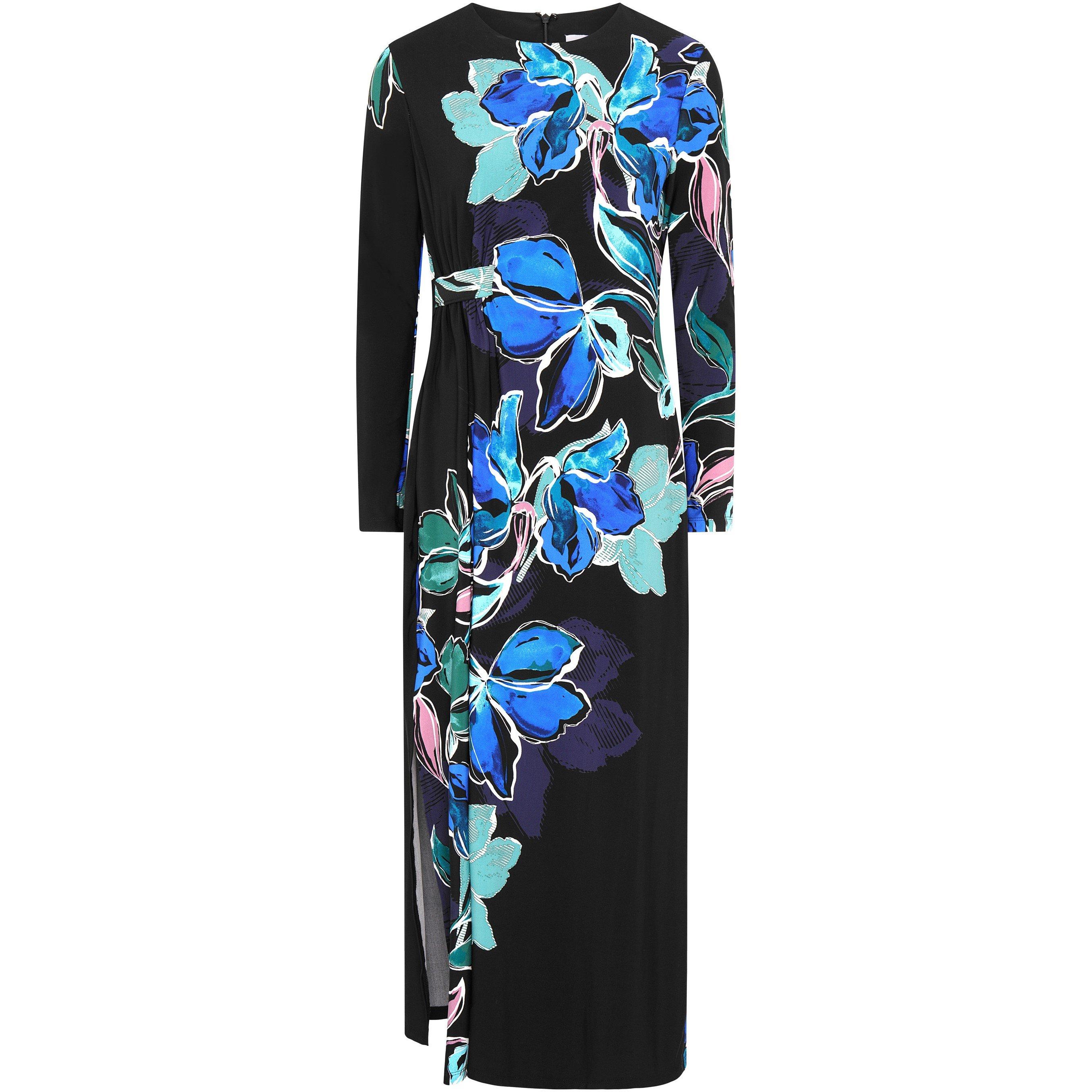 This elegant Eli dress features a striking floral print in shades of blue and green on a black base. Designed with a sleek silhouette, the dress has a slit on the side that adds a touch of sophistication. The long sleeves and flowing fabric creates a flattering, polished look perfect for parties and evening events. Measuring 133cm and lined.