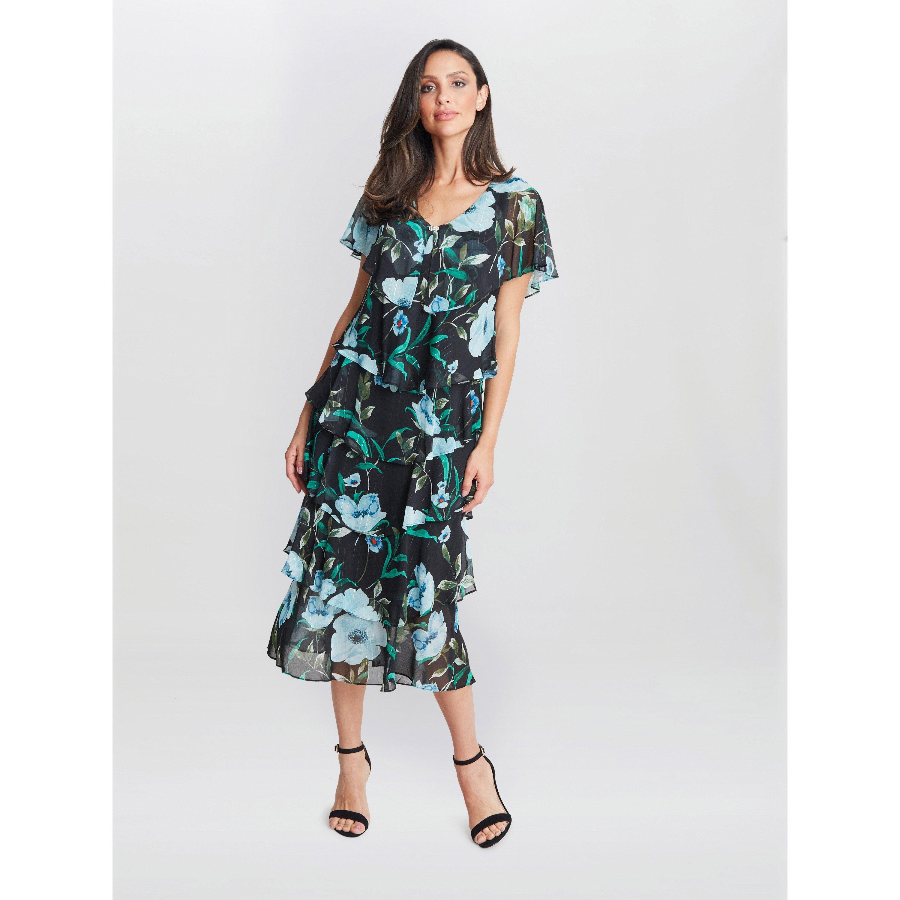 The Gina Bacconi wonder dress! This tiered dress is flattering, elegant and falls at the mid-calf. Perfect for all your occasions. The Frances comes in a beautiful floral print with subtle metallic thread.
