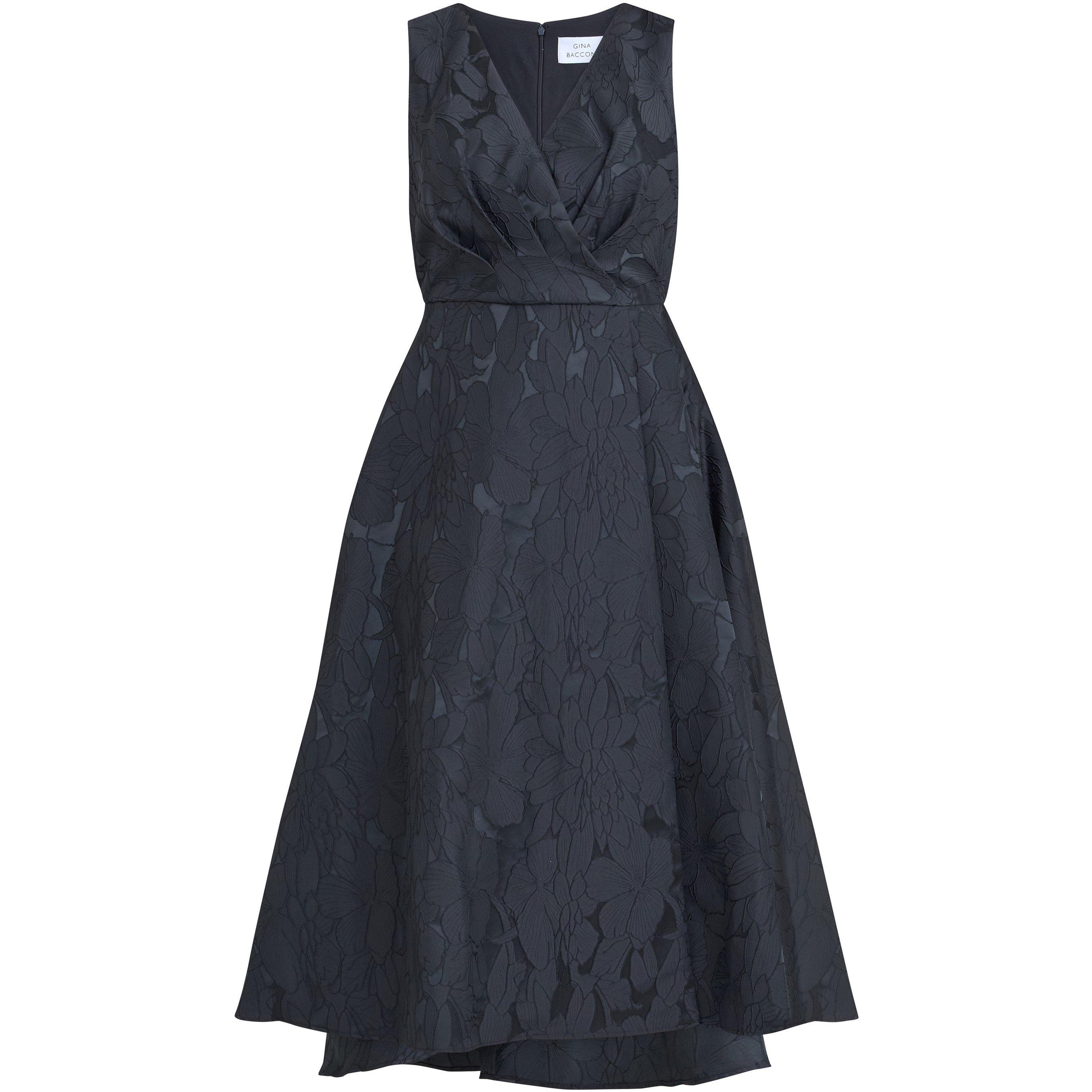Gina Bacconi's Sandie Jacquard Fit and Flare Dress showcases a textured floral print with a sleeveless style and wrap-style bodice that flatters the feminine form through its cinched waist design.