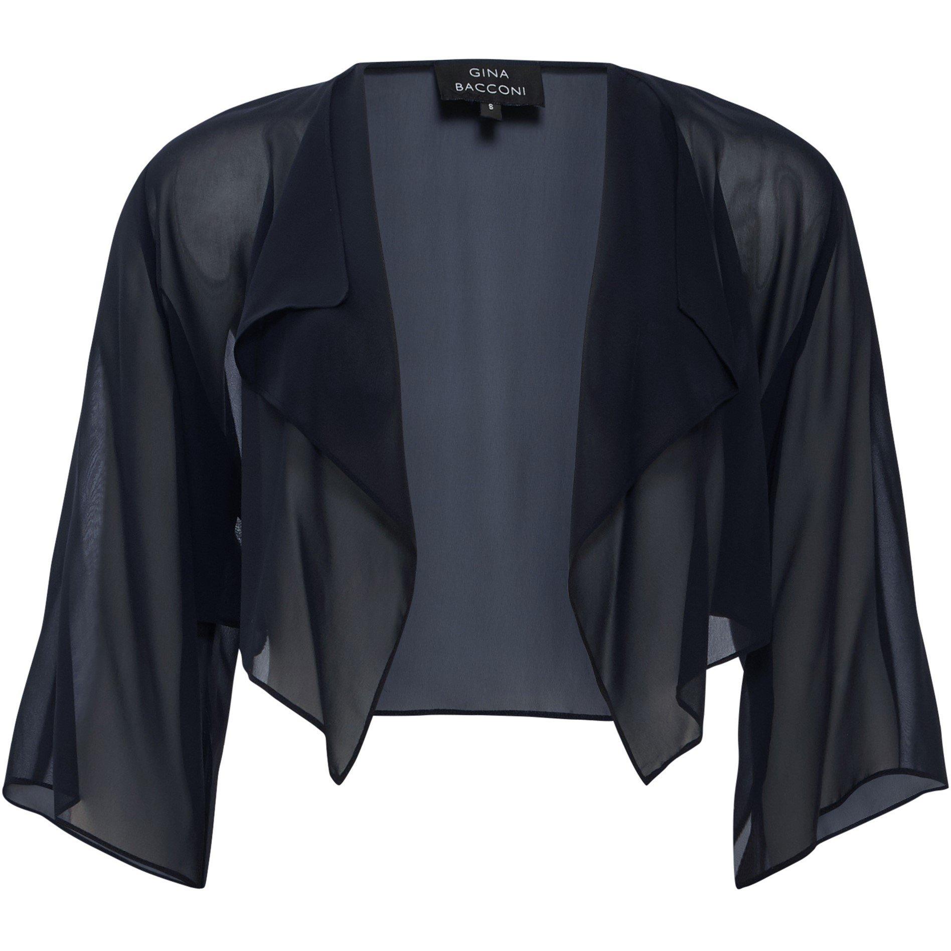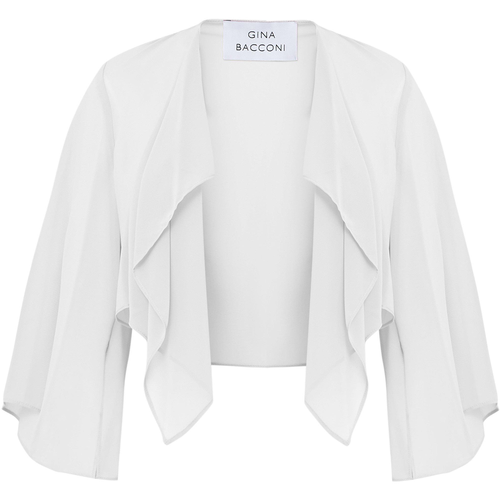 The Gina Bacconi Vivian Waterfall Jacket offers coverage with its flowing shape. Made from soft, lightweight fabric with 3/4 length sleeves, this piece features a graceful waterfall front that adds movement and dimension to any outfit.