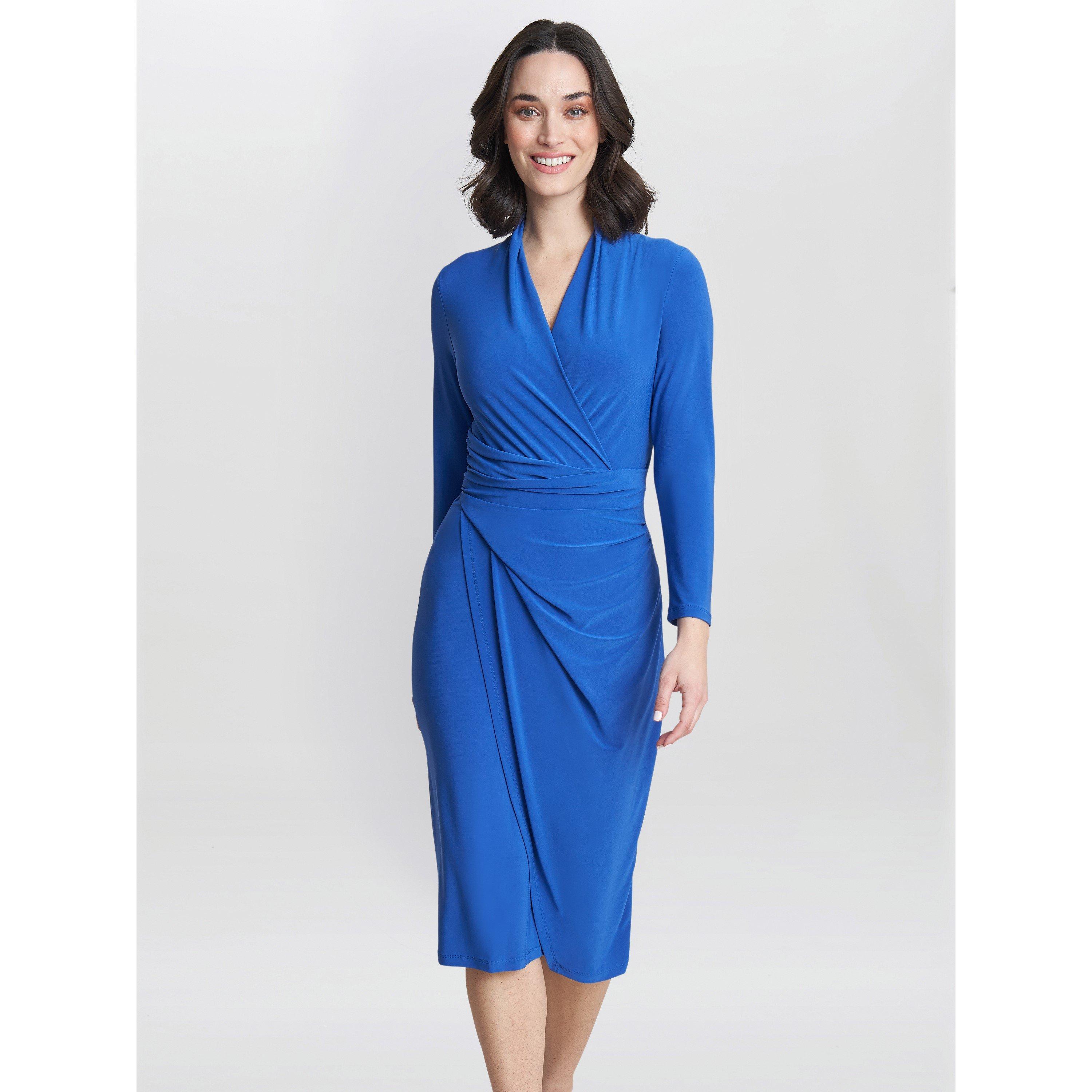 Our new modern jersey dress features a ruched waist and wrap effect and long sleeves. Perfect to dress up or down.