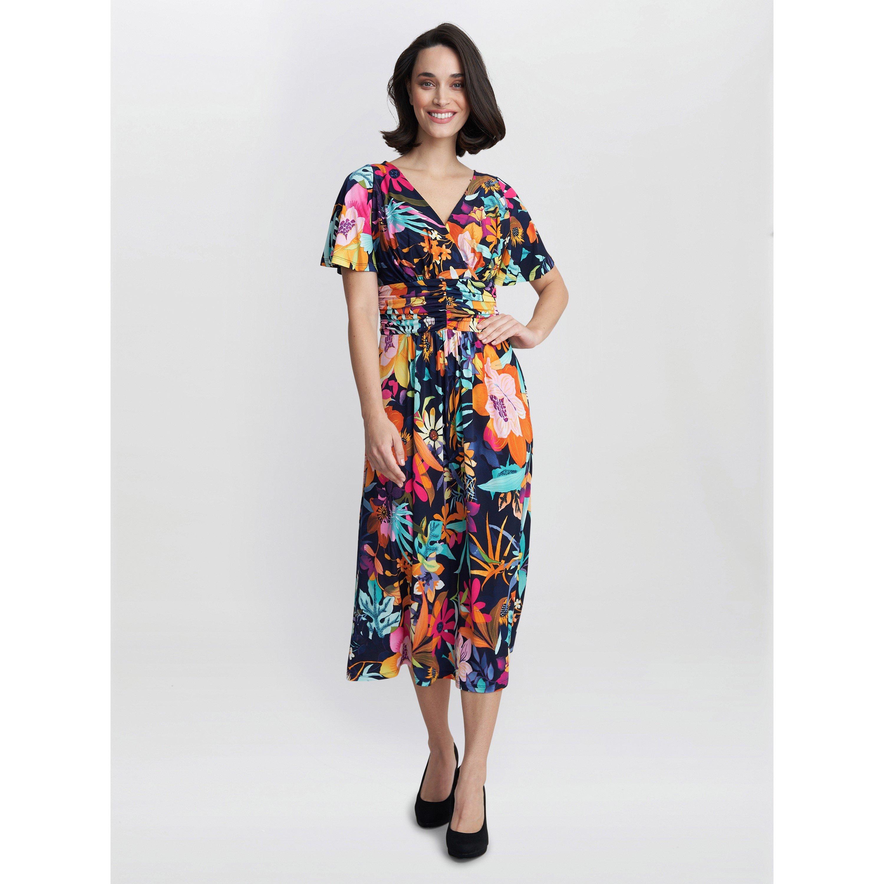 Fashioned from comfortable jersey fabric in a gorgeous print, this dress is guaranteed to make you stand out. The bodice takes an elegant wrap-over design and gathers at the waistline before giving way to a flowing midi skirt. It features a flutter sleeve and is zip-free for ease.