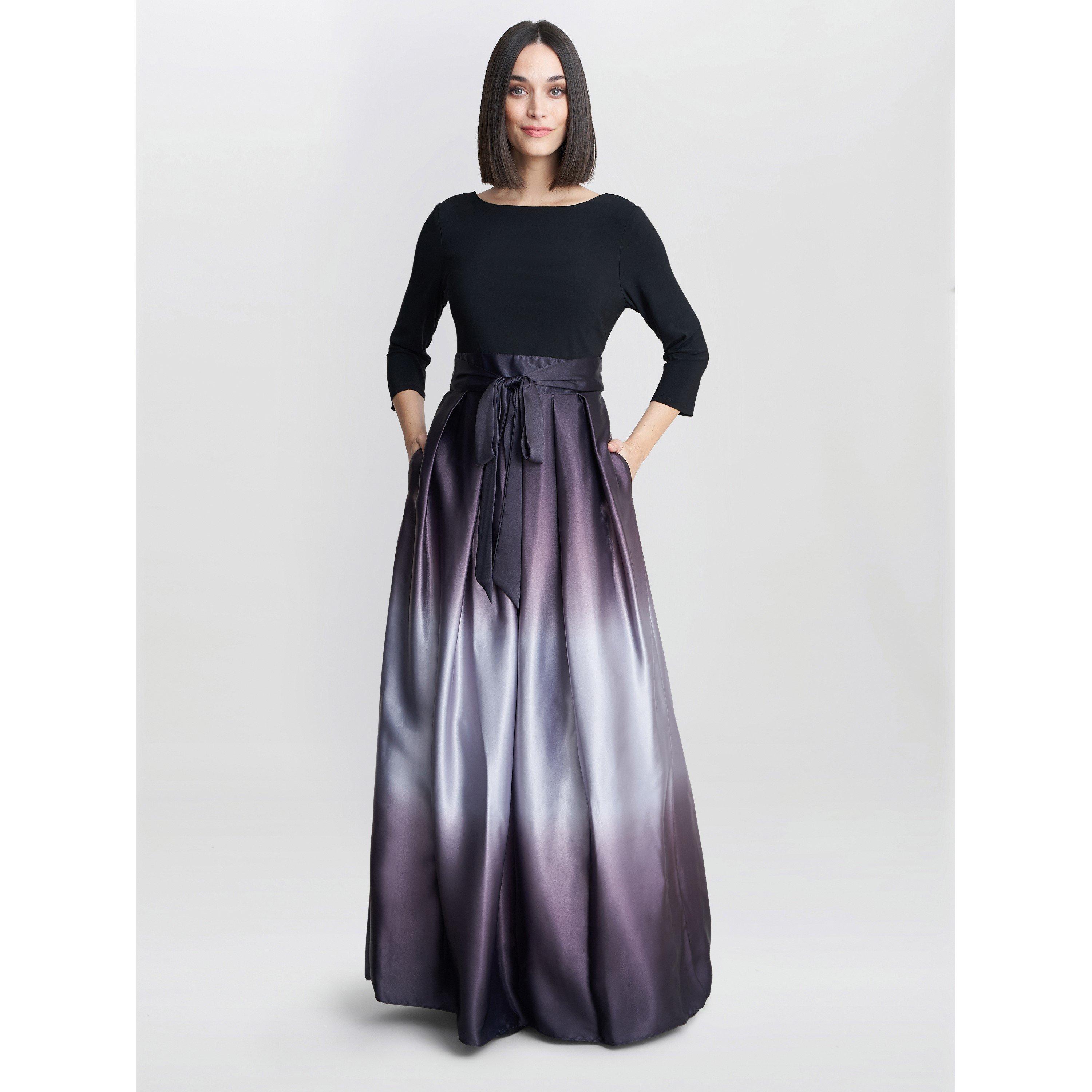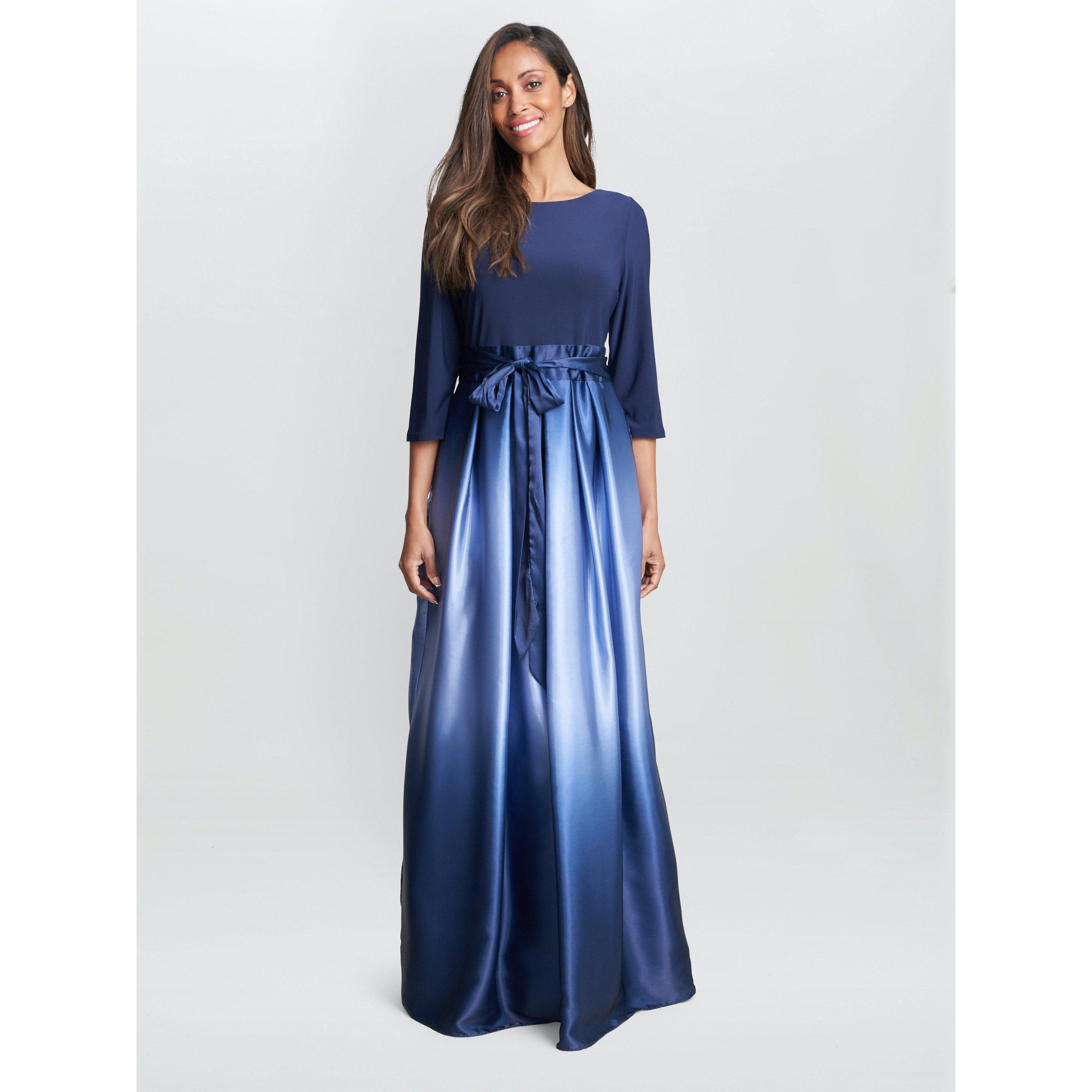 Stand out in this showstopper maxi dress by Gina Bacconi. A lined jersey bodice is gathered and belted at the waist with satin, from here an ombre chiffon skirt flows down to create a full skirt. We think this would be perfect for a smart evening event with a pair of heels.