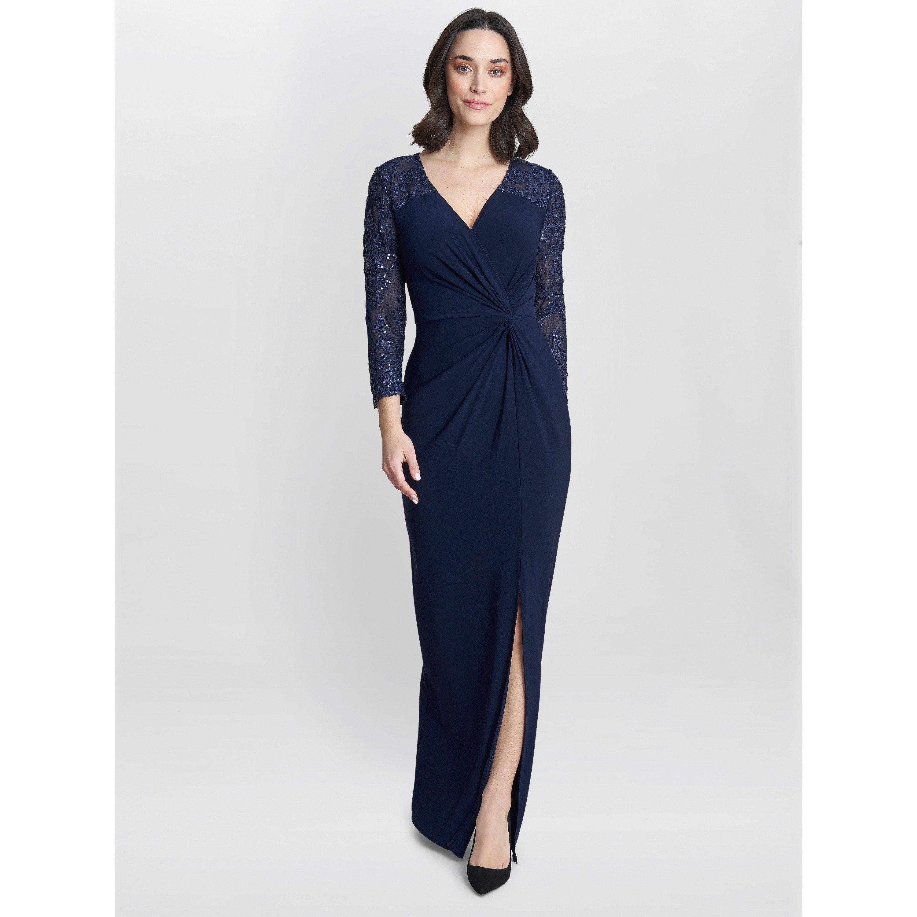 Gorgeous twist knot from jersey maxi dress with sequin embroidered toke and sleees. Sure to wow this dress also features a front side split. Perfet for that special occasion.