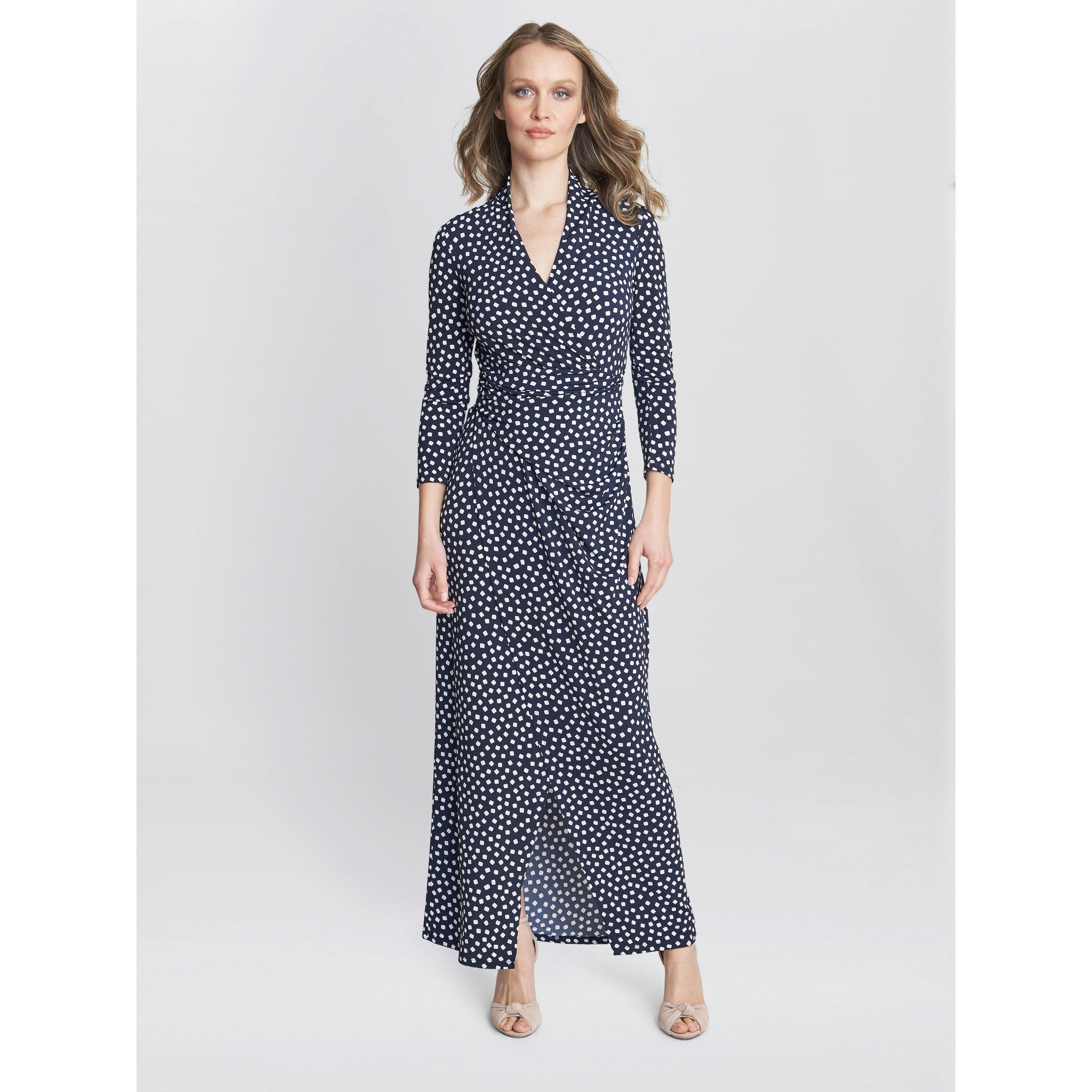 Our new modern jersey dress features a ruched waist and wrap effect. This monochrome print is eyecatching and easy to match with a black or nude accessory.