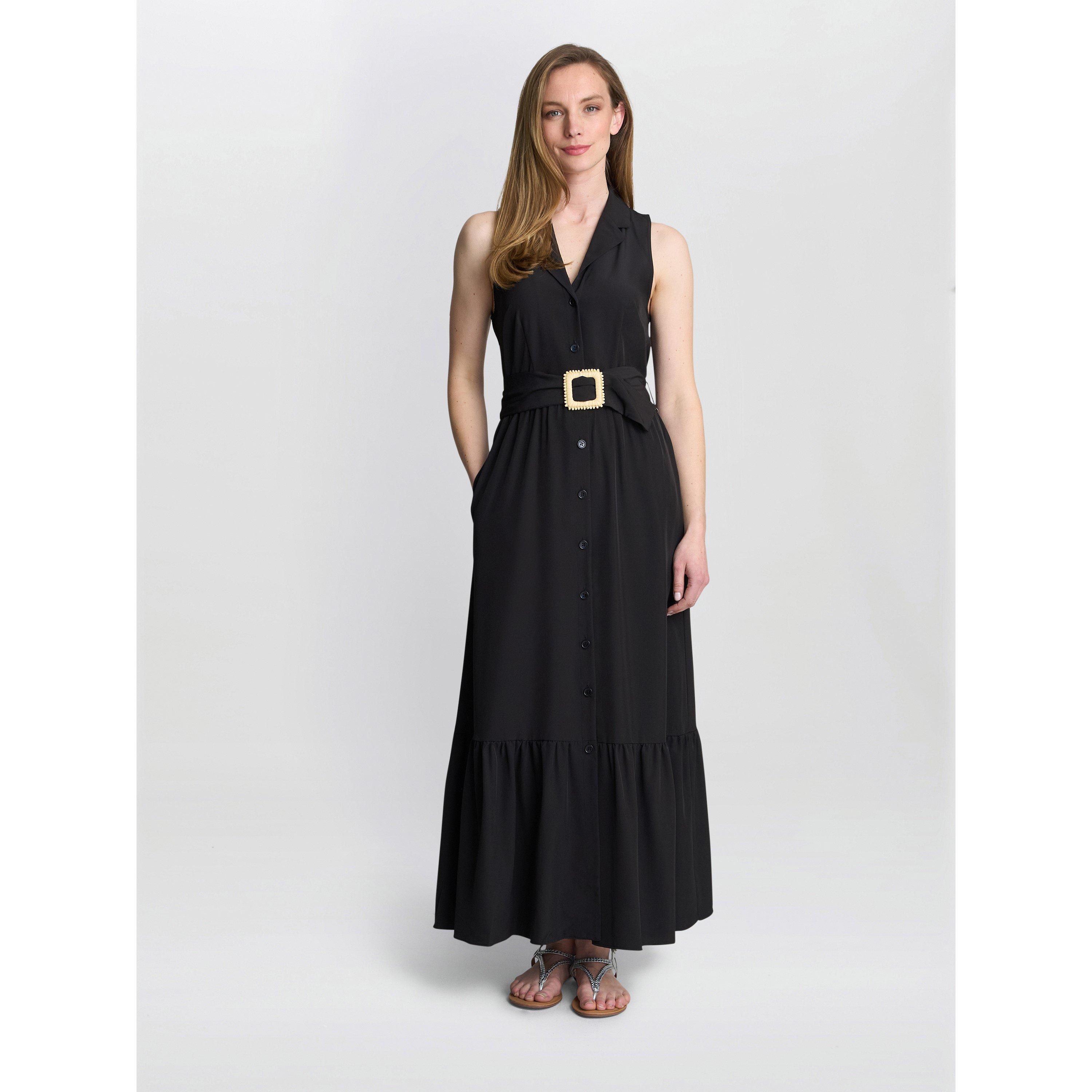 Gina Bacconi's Jamie Shirt Dress is a sleeveless long maxi with a collared detail. The square-buckle belt cinches the waist for a flattering profile, while the full button-down front offers styling options to suit your personal style.