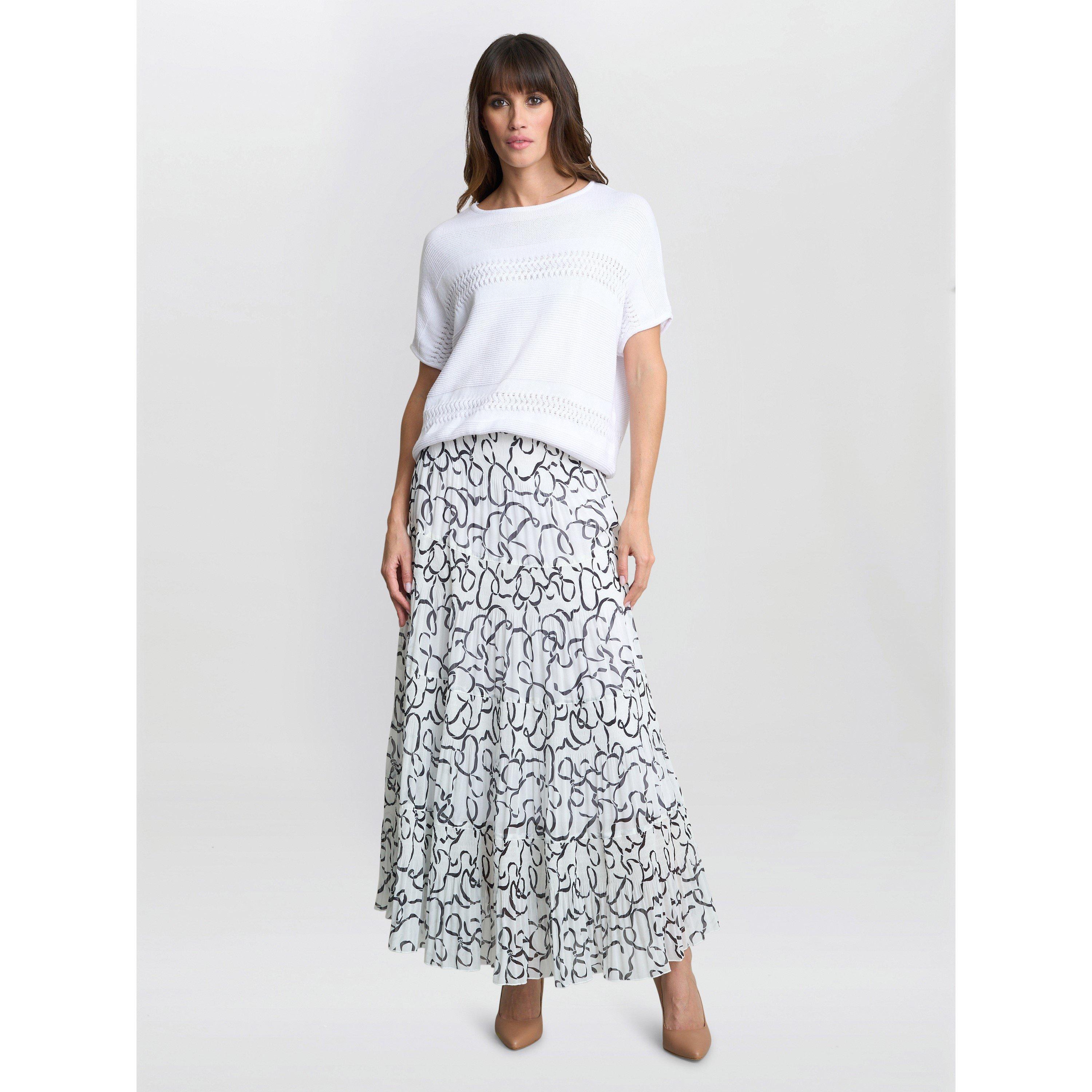 The Jasmina skirt is a fashionable piece which is white with black abstract. Gorgeous, elastic waist, pull-on, pleated abstract print skirt. This skirt is easy to wear but looks fabulous! Dress up or down for a versatile look!