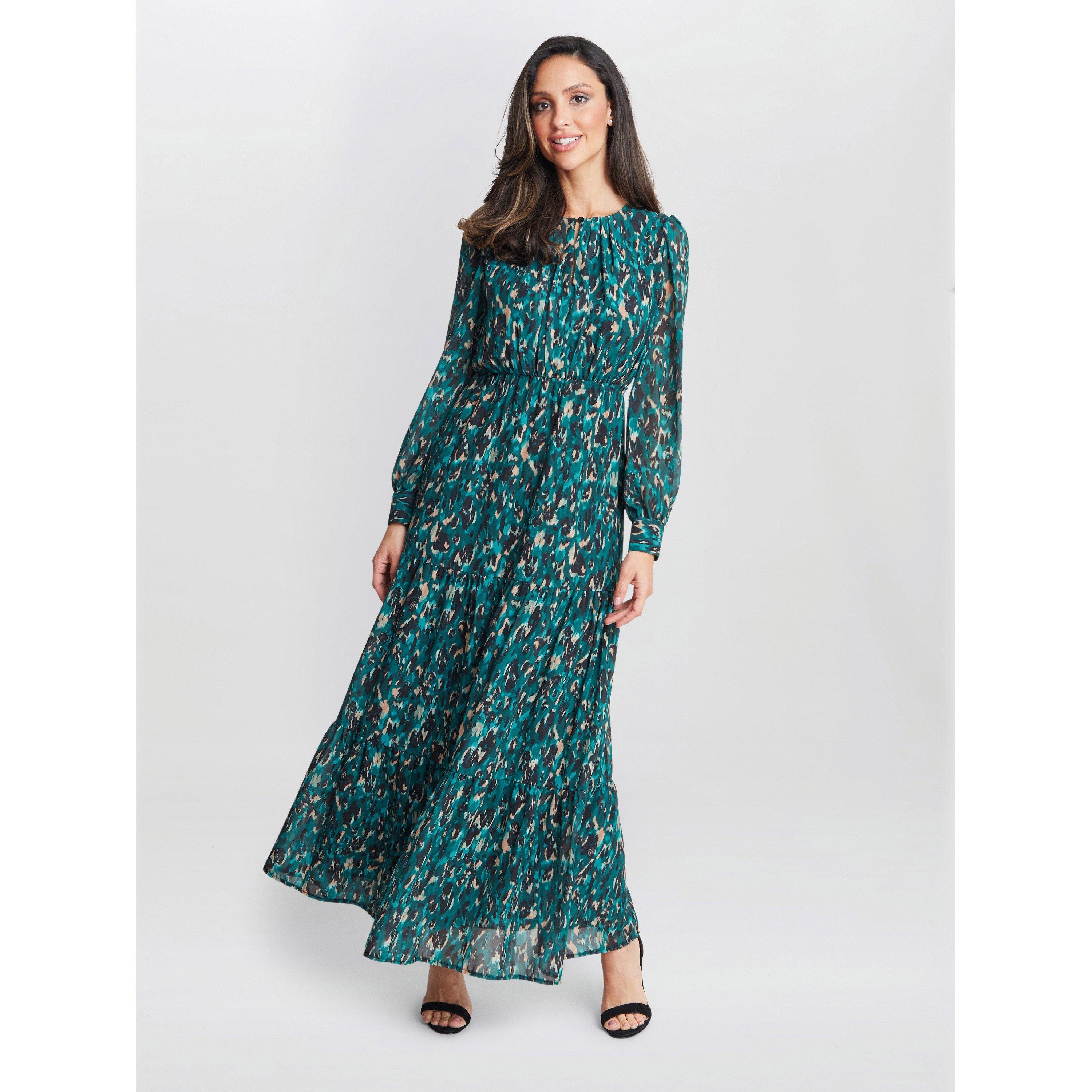 Easy day to evening chiffon dress in a summery print. This dress features a buttoned front neck and cuffed long sleeves, it has a full skirt and an elasticated waist for ease. Dress up or down with heels or flats.