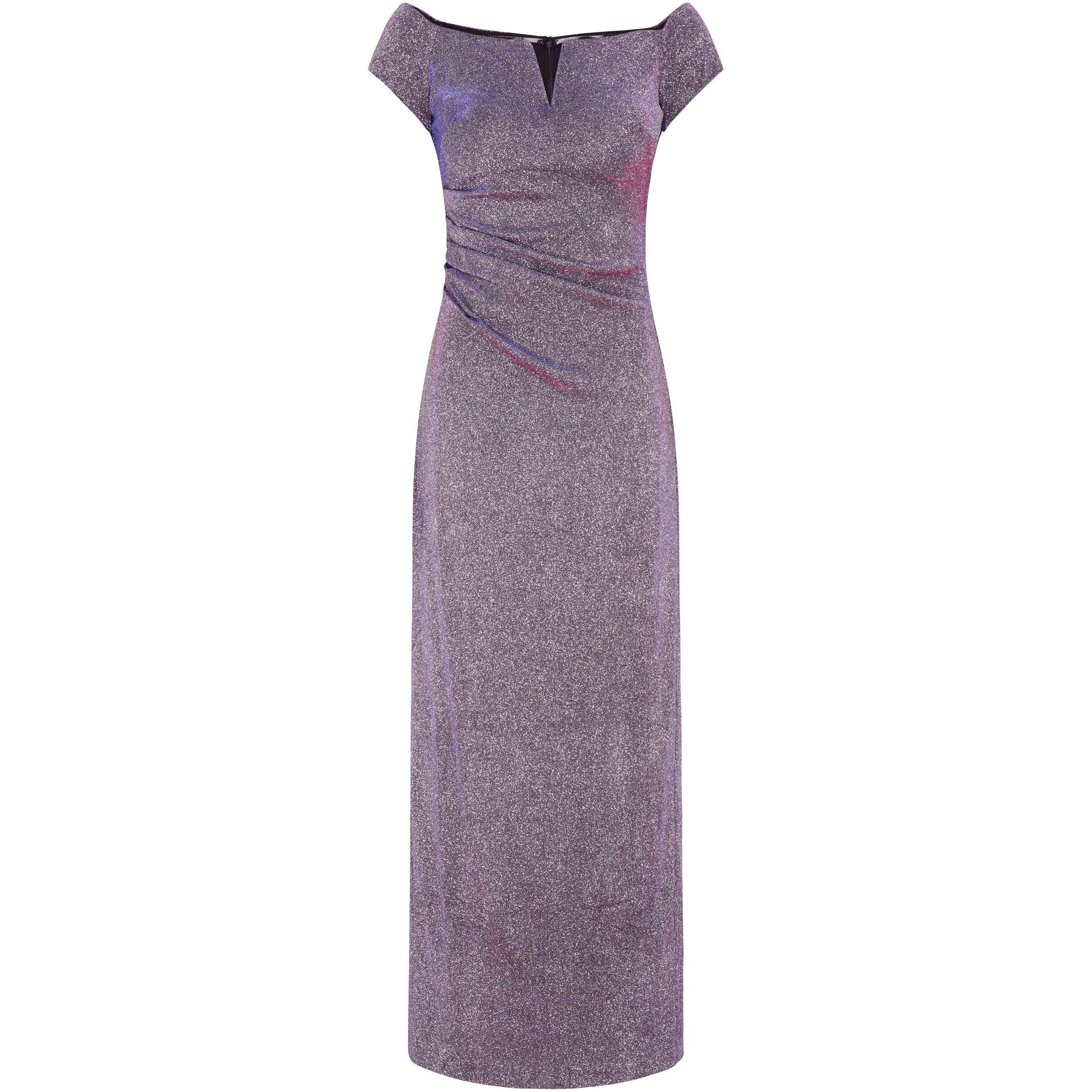 Sparkle this season in our new Katie off shoulder maxi dress. This elegant dress features a striking ombre metallic effect, blending deep black into purple with a shimmering glitter finish throughout. The off shoulder neckline and draping at the front enhances the silhouette. Perfect for black tie events, weddings, or any glamorous occasion. This dress is fully lined.