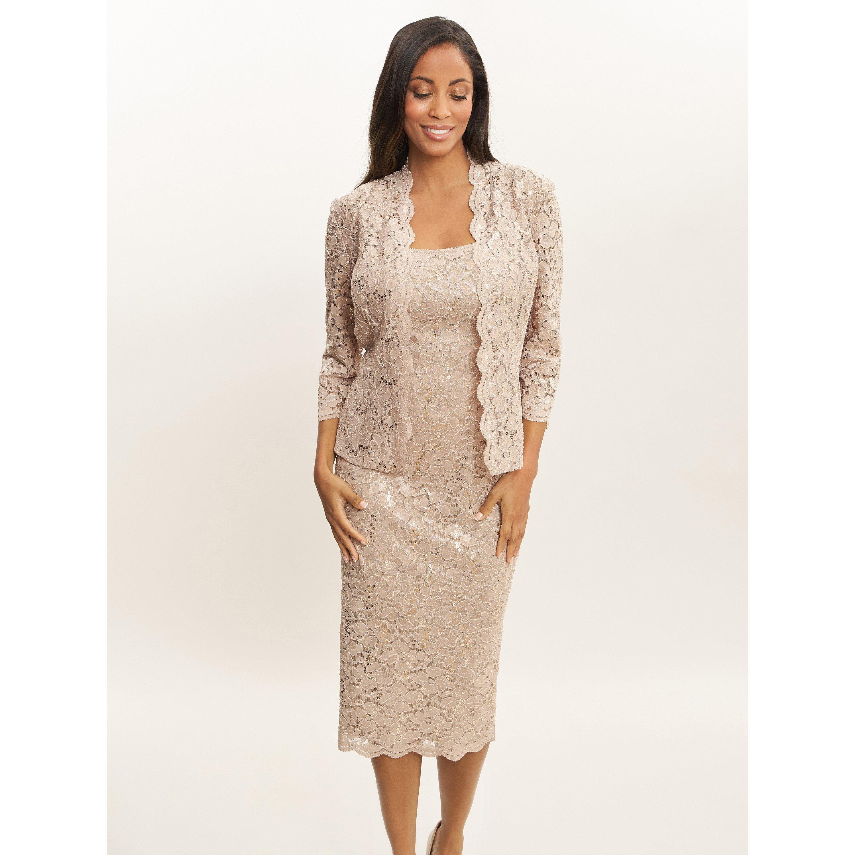 Flatter those refined assets while glowing with poise in this Gina Bacconi creation. Tailored in shimmering sequined lace this dress parades a square neckline with a scooped back. This sleeveless stunner sculpts with a fitted tea length silhouette. Scalloped trimmed the lace jacket crafts a quarter sleeve open jacket.