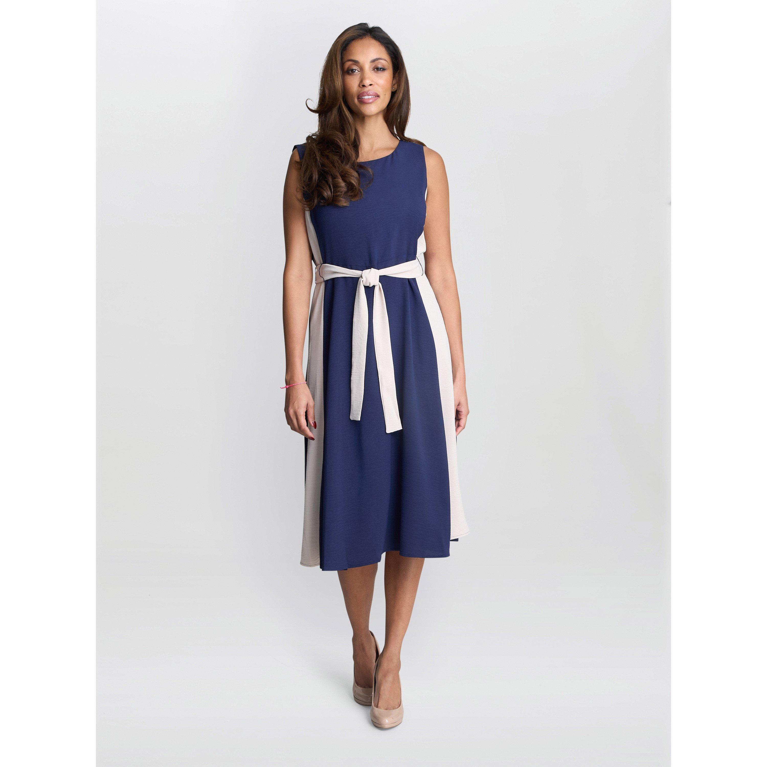 Gina Bacconi's Kendall A-Line Dress creates a sleek shape. The sleeveless midi design features a matching belt that cinches the waist for a flattering, elongated profile and defines the dress's shape.