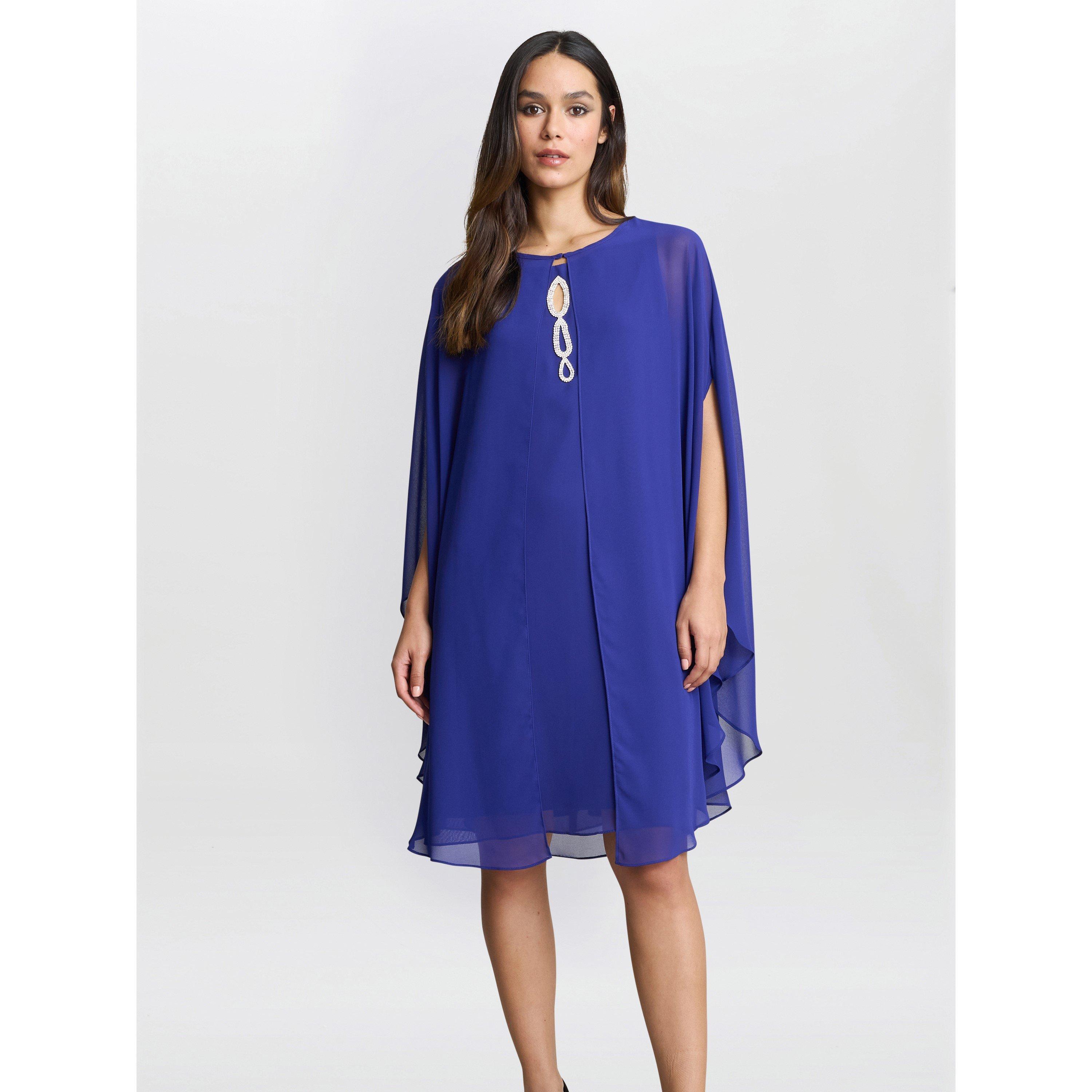 A stunning dress and cape by Gina Bacconi. The dress is crafted from a lightweight chiffon that ensures you will look graceful as you move. It features round neckline with gorgeous beaded design that adds glitz and glamour. The dress is fully lined and fastens with a concealed back zip. The separate chiffon cape drapes perfectly over your bodice. It is a perfect outfit for a special occasion.