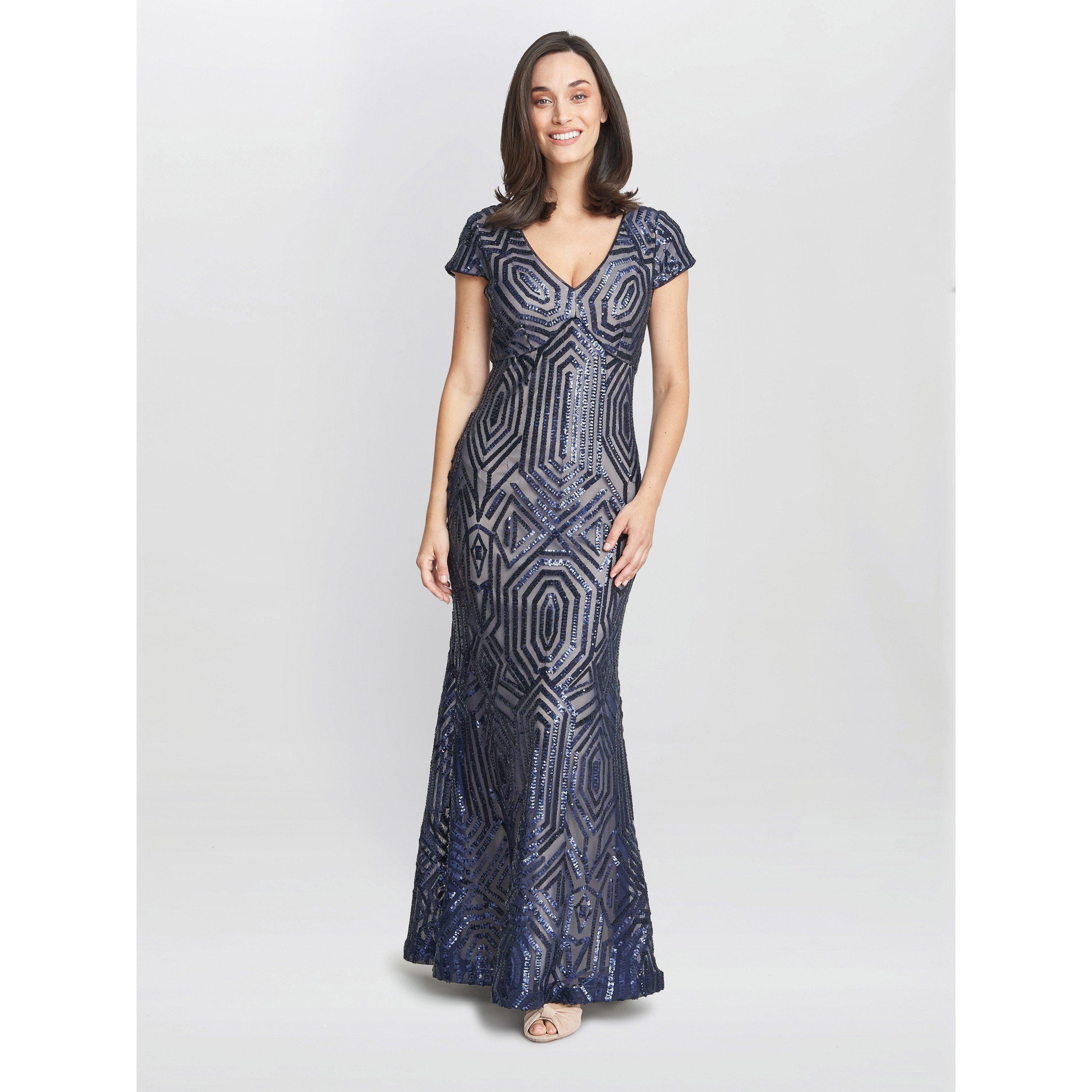 This striking sequin beaded dress is sure to turn heads! The geometic design is placed to enhance and flatter the femal shape, white the v-neck and acap sleeve offer a delcate neck line.
