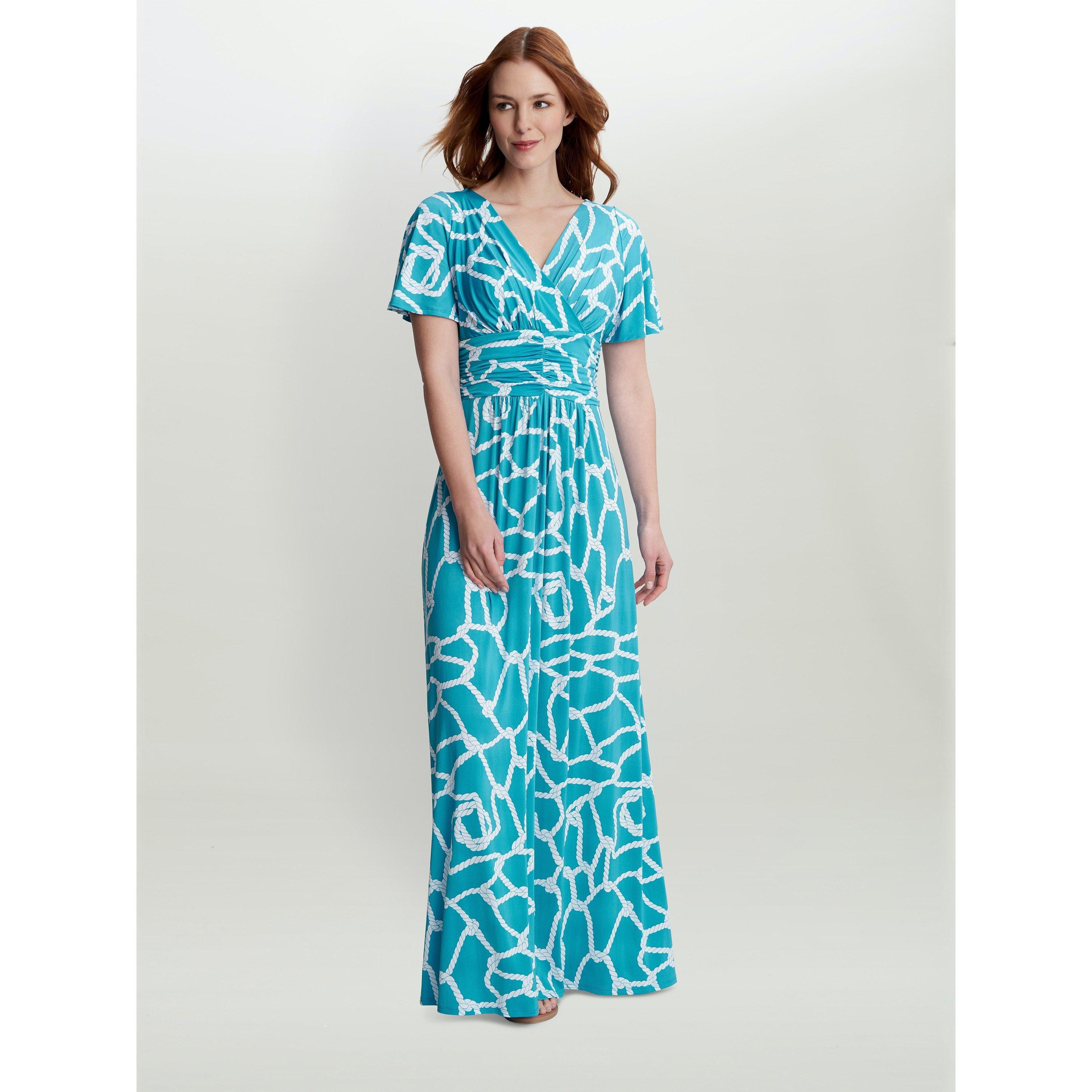 This maxi dress by Gina Bacconi is the ultimate holiday piece for your wardrobe this season. Fashioned from a comfortable jersey fabric with a gorgeous print, this dress is guaranteed to make you stand out. The bodice takes an elegant wrap-over design and gathered empire waistline before giving way to a flowing skirt. Add a pair of sandals and some sunglasses and you have the perfect holiday look!