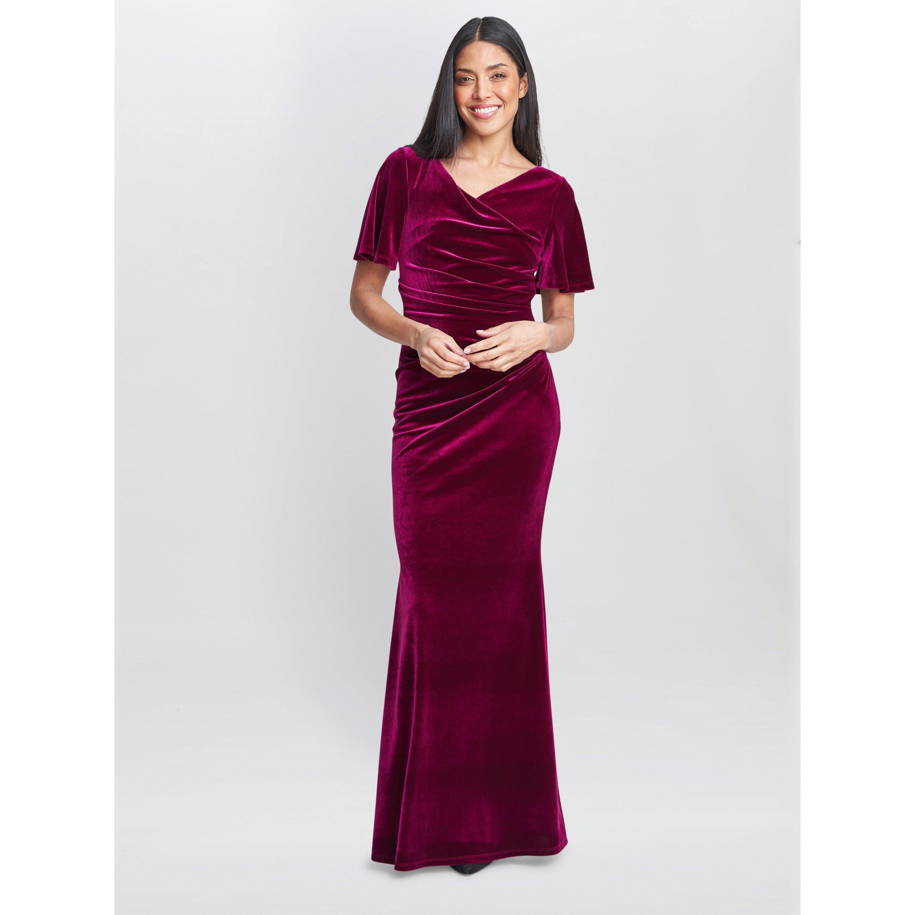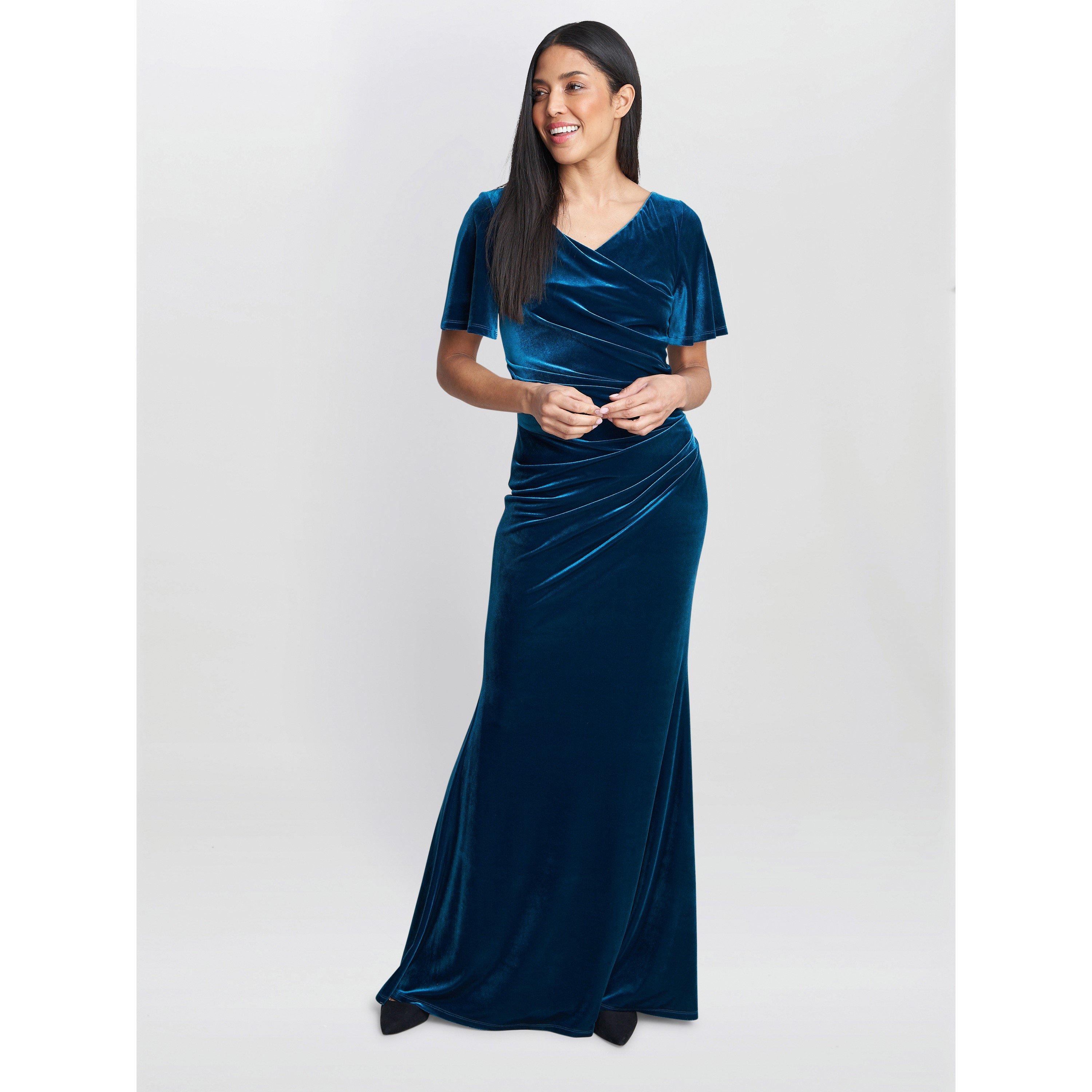Feel elegant in this velvet maxi dress by Gina Bacconi. A beautifully tailored dress fashioned from soft velvet featuring a cowl neckline and frilled short sleeves. Flattering side ruching make for elegant touches to the dress.The dress is fully lined and fastens using a concealed back zip.