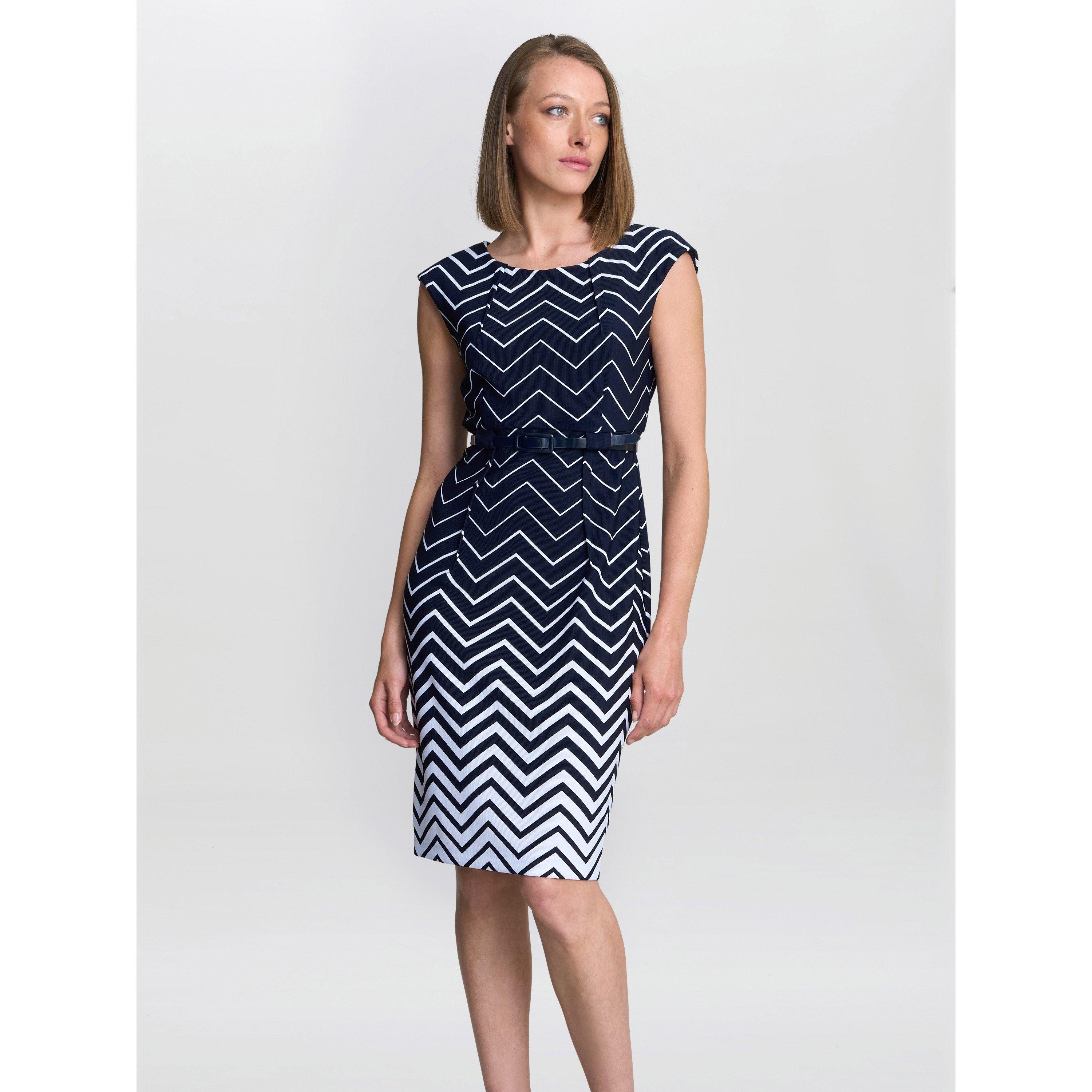 Chic and versatile, this flattering chevron stripe crepe dress transitions effortlessly from day to evening. The abstract print creates a slimming silhouette, while the belted waist enhances your shape for a polished, confident look. This dress features a back zip.