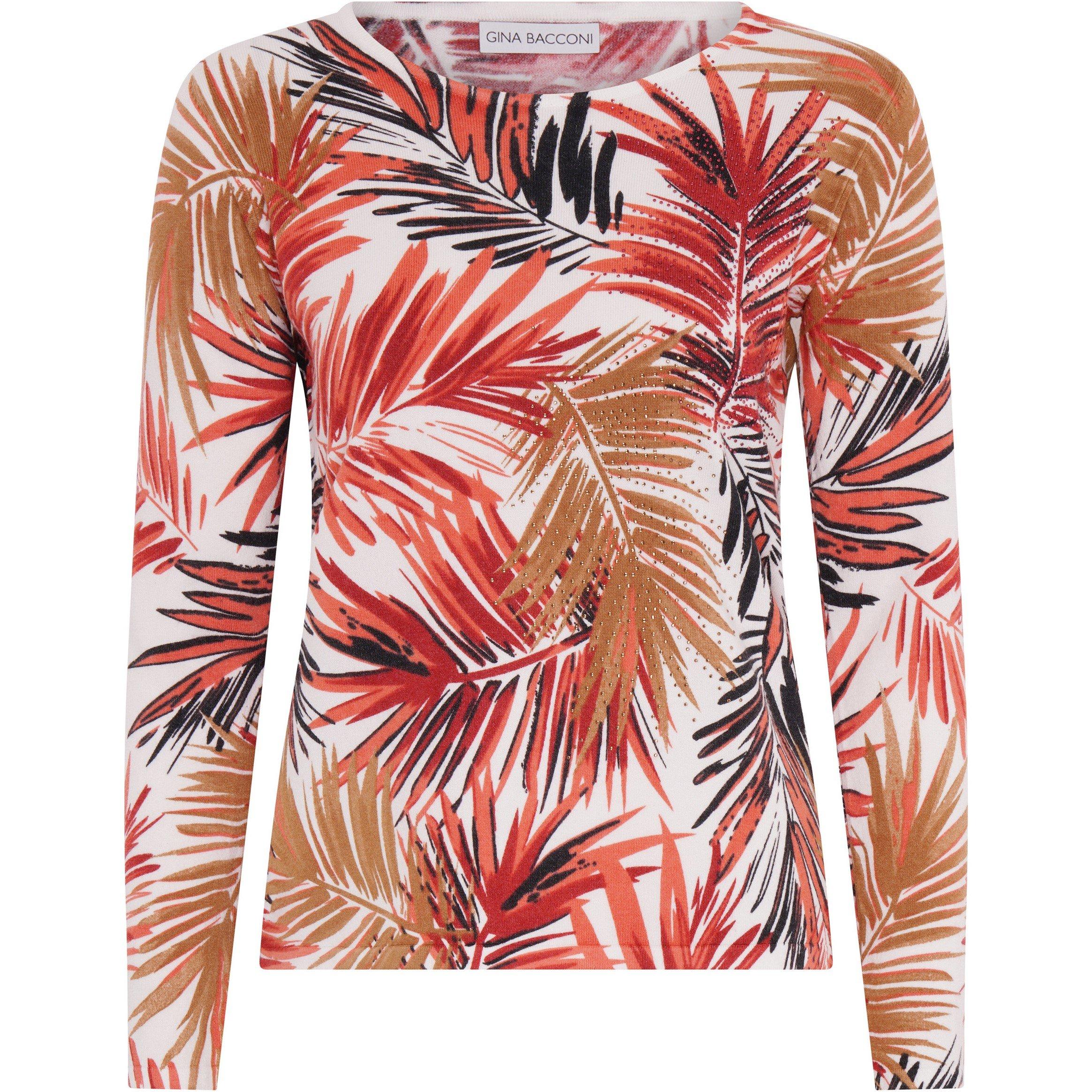 Make a bold statement with our new Nanette jumper. Featuring a striking orange, red and yellow leaf print, this long sleeve jumper is modern. The soft fabric offers comfort while the silhouette flatters the figure. Perfectly paired with skirts or trousers.