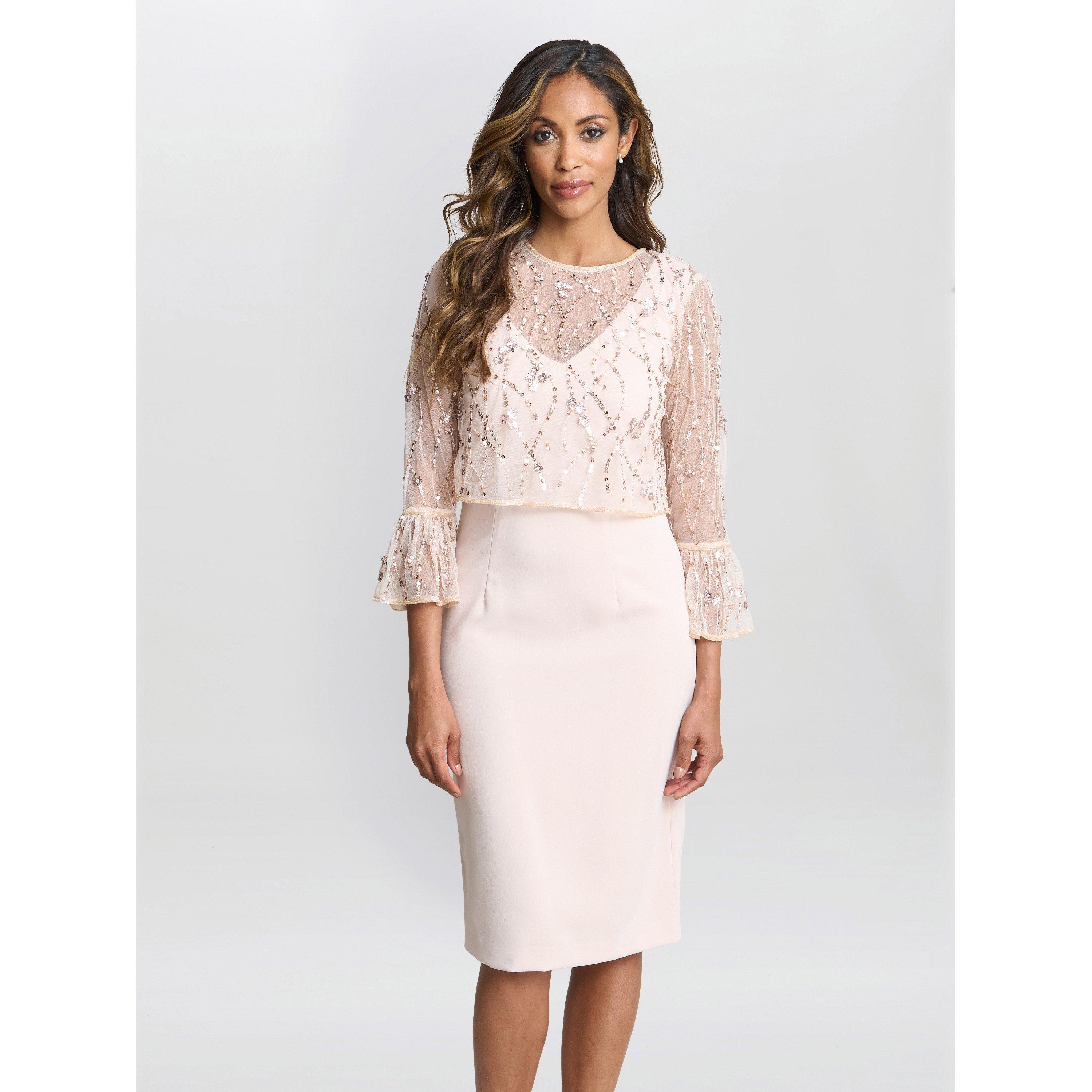 A staple in every wardrobe, this simple shift shape dress is fashioned from a gorgeous stretch crepe fabric and is accompanied by an elegant and eye-catching cape beaded mesh jacket that does up with a small hook and eye. The jacket can be worn with the hook and eye to the front or back. the dress can also be worn alone with or teamed with the Gigi jacket.