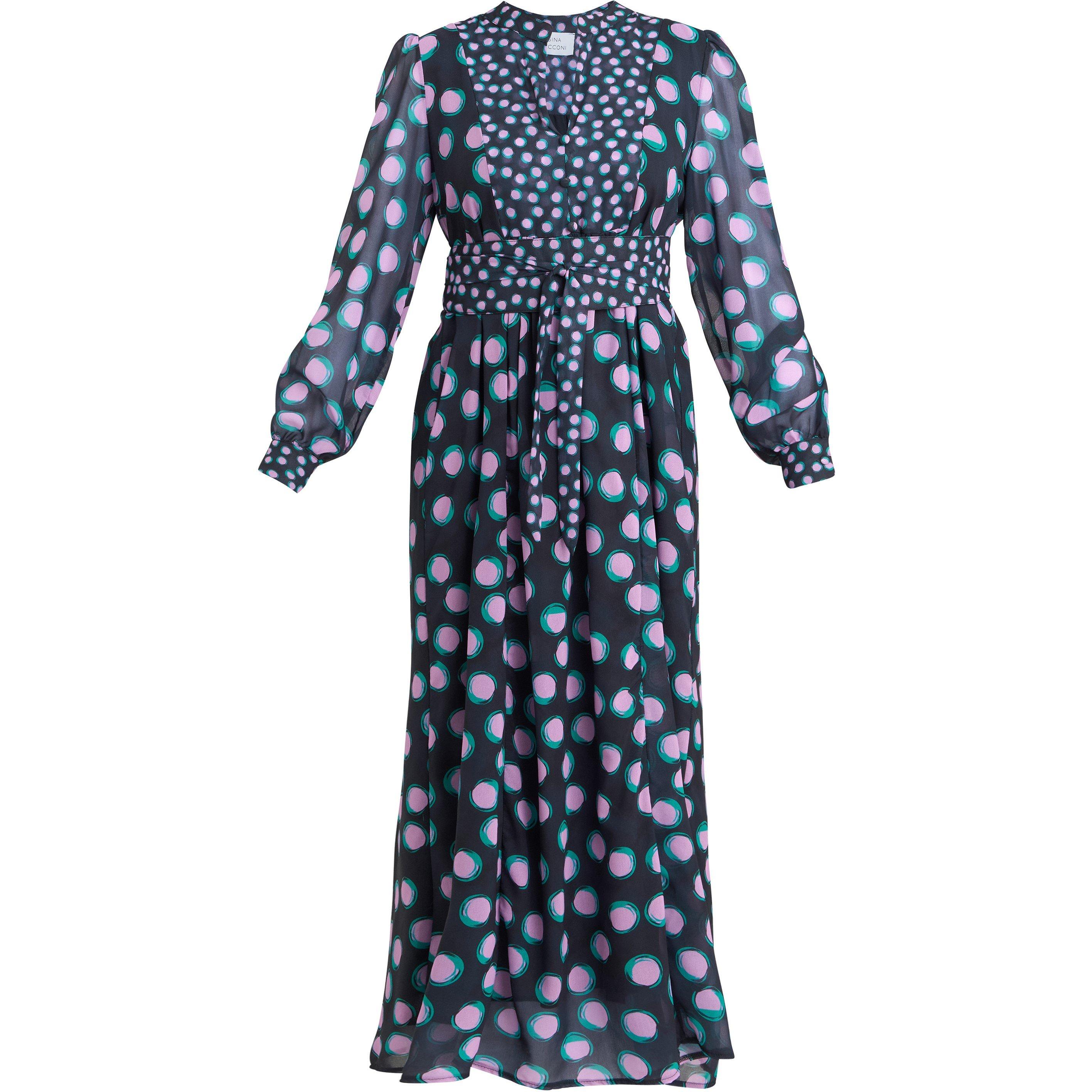 Effortlessly elegant with a touch of charm, the Renata dress is your go to for timeless sophistication. Featuring a soft polka dot print in shades of pink and green on a black base. The full length sheer sleeves and skirt add graceful movement, while the soft inner lining ensures comfort throughout the day. Perfect for garden parties or any special occasion.