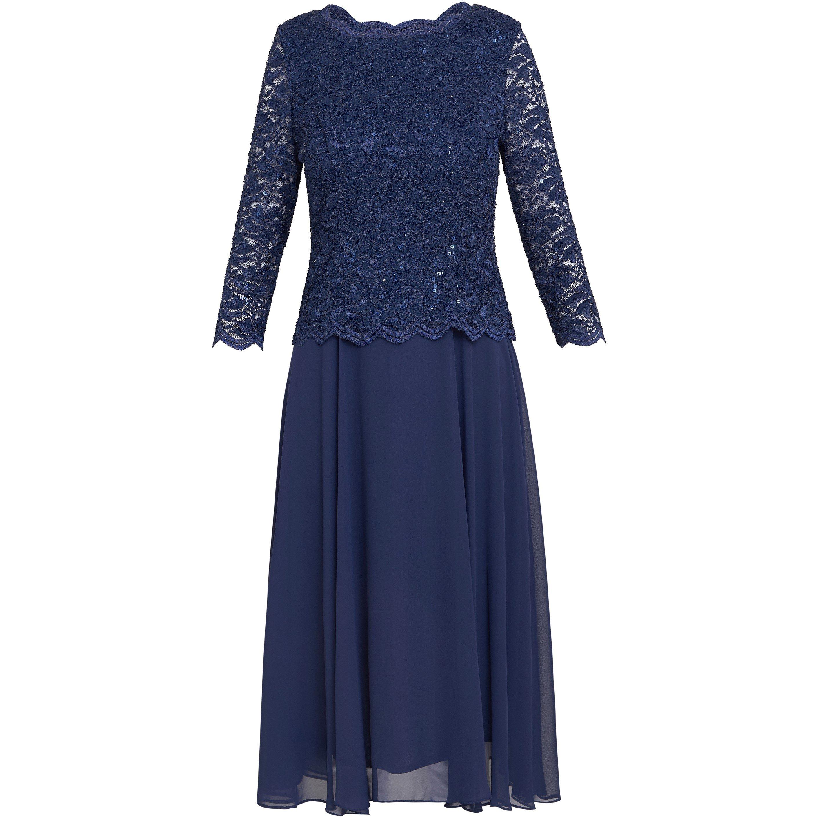 This midi-length mock 2-piece cocktail dress is the picture of elegance with sheer lace 3/4 sleeves, silky chiffon skirt & scalloped lace edges.