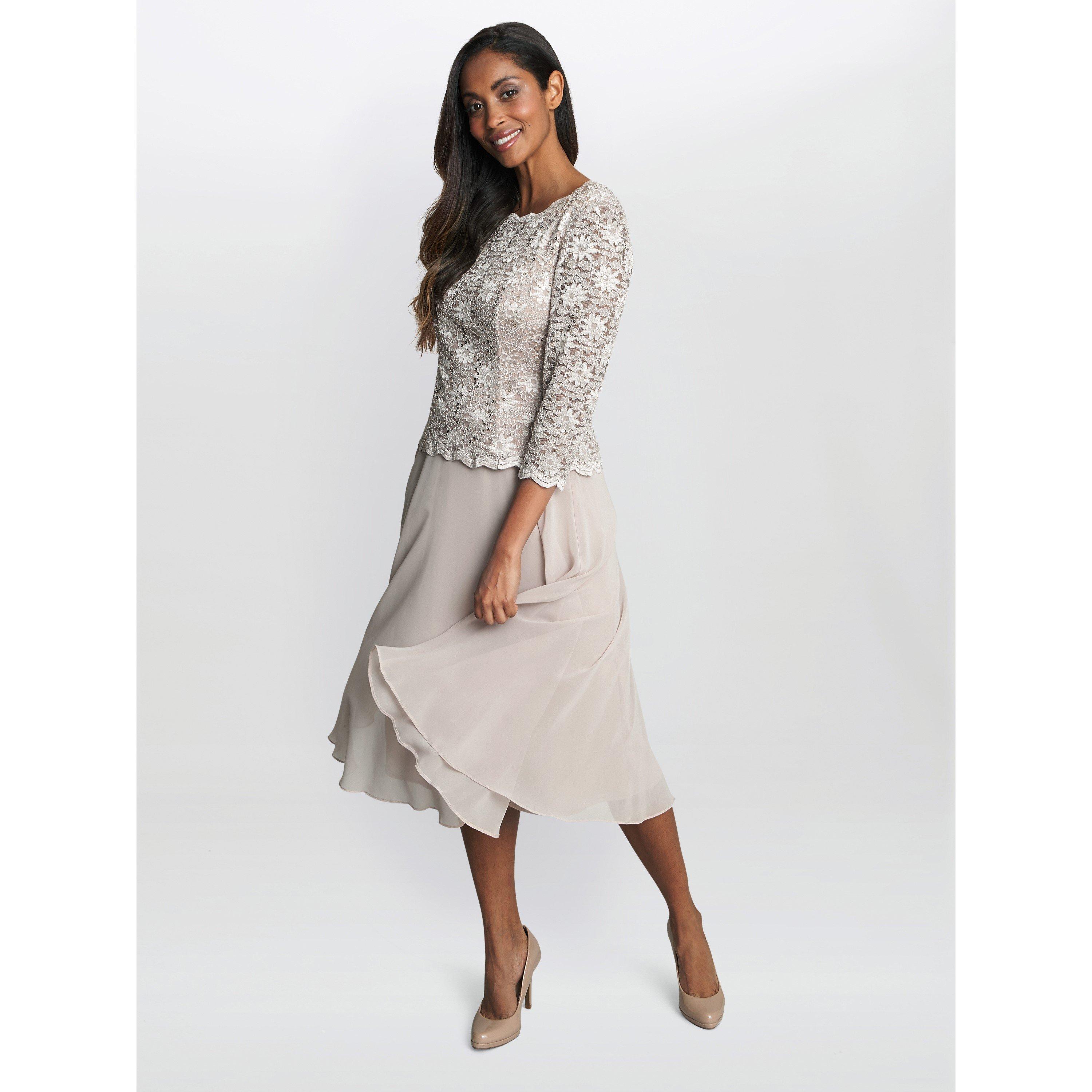 This midi-length mock 2-piece cocktail dress is the picture of elegance with sheer lace 3/4 sleeves, silky chiffon skirt & scalloped lace edges.