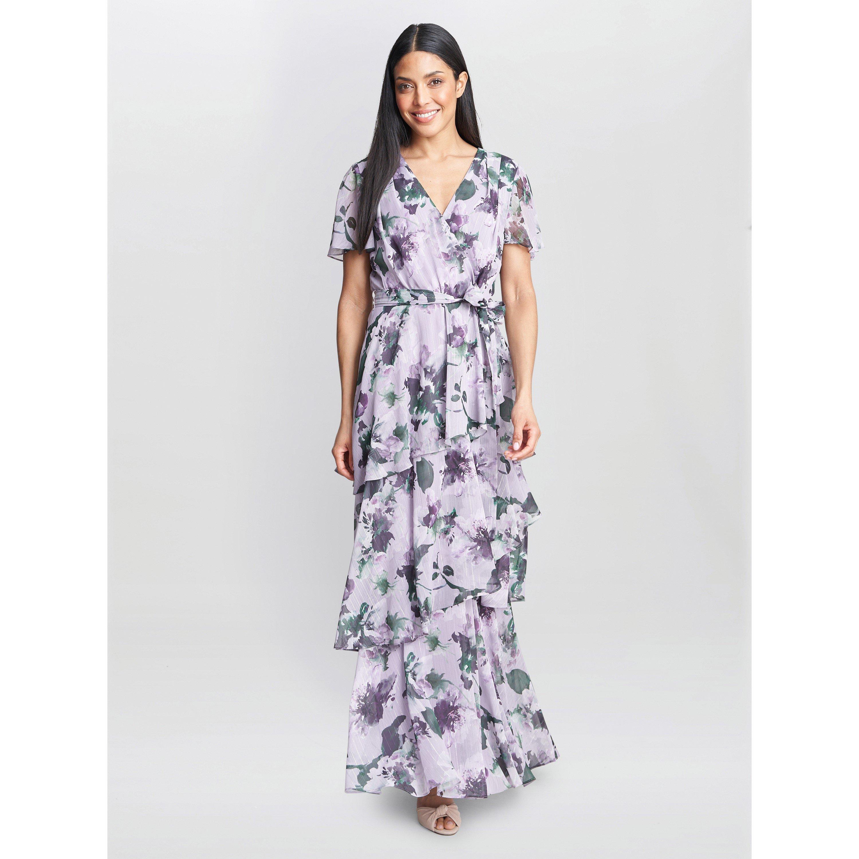 A beautiful tiered maxi dress, with short sleeves and a mock wrap bodice. This dress is fashioned in a delicate mauve floral on a lurex chiffon. It has a center back zip.