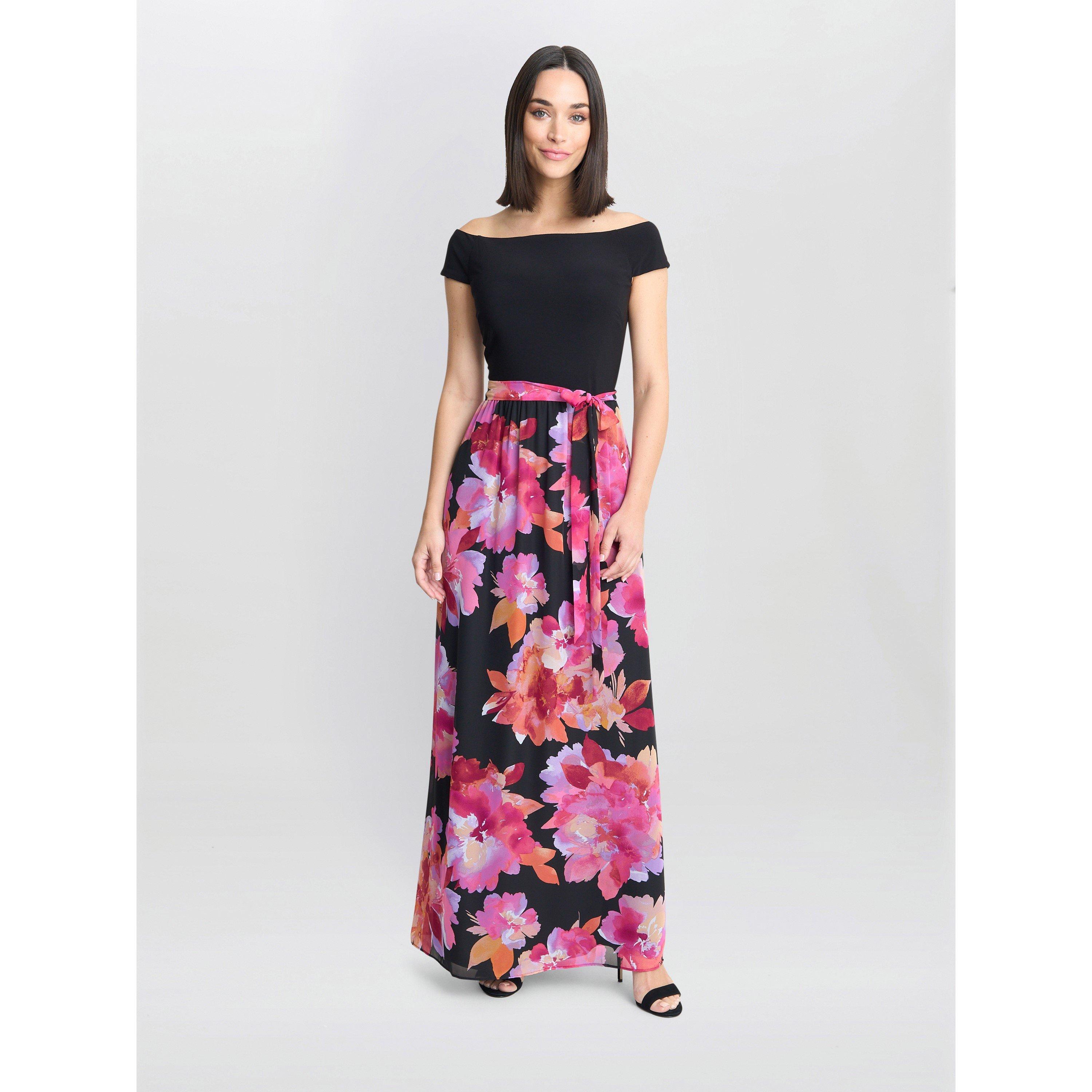 Stand out in this show stopper maxi dress by Gina Bacconi. Featuring a lined jersey bardot bodice and floral chiffon full skirt. This would be perfect for a smart evening event with a pair of heels or with flat sandals on a sunny day. The dress is fastened using a concealed back zip, and has a self chiffon belf.