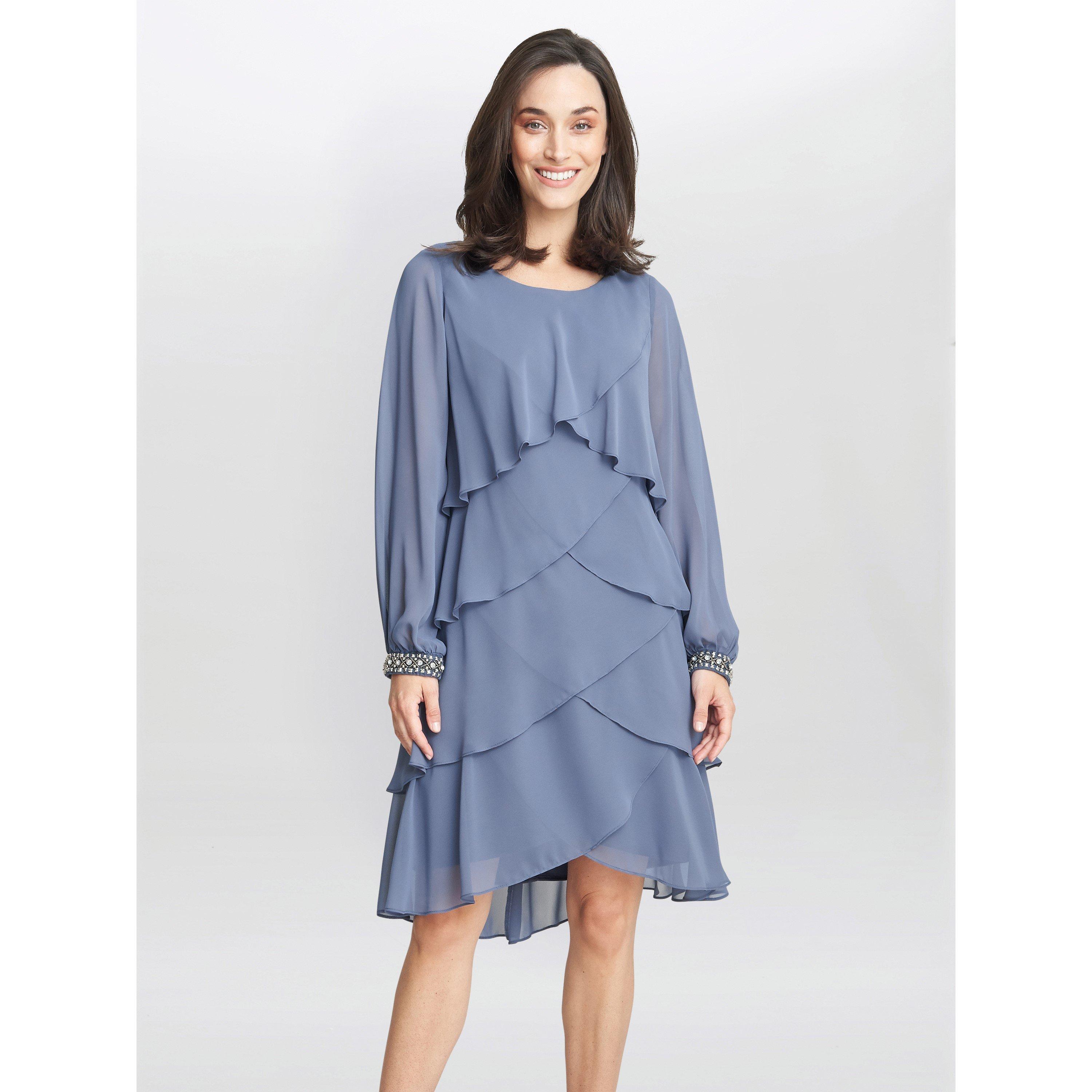 Make this tiered dress by Gina Bacconi part of your wardrobe this season. Fashioned from a lightweight chiffon this dress moves beautifully as you walk. Featuring diamante and beaded detailing at the cuffs.This dress features long sleeves with slits down the sides. Feminine, elegant and comfortable, this is the ultimate party piece. The dress is partially lined.