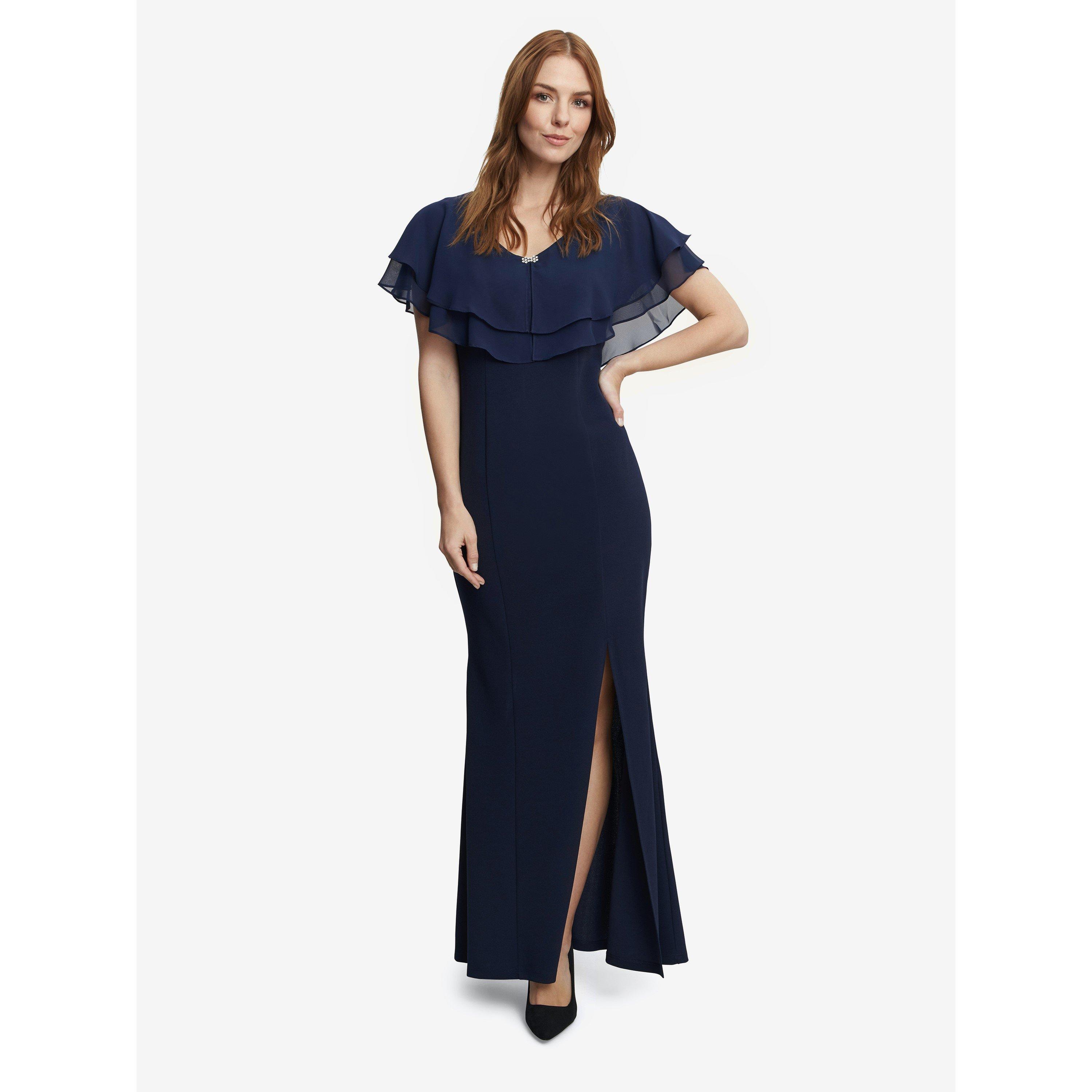 Add this elegant scuba crepe and chiffon maxi dress by Gina Bacconi to your wardrobe this season. This beautifully fitted maxi dress is given a modern uplift with a built-in cape detail which is crafted in floaty chiffon with diamante detailing to front. The dress fastens with a concealed back zip. Pair with heels and a simple clutch for a sophisticated ensemble.